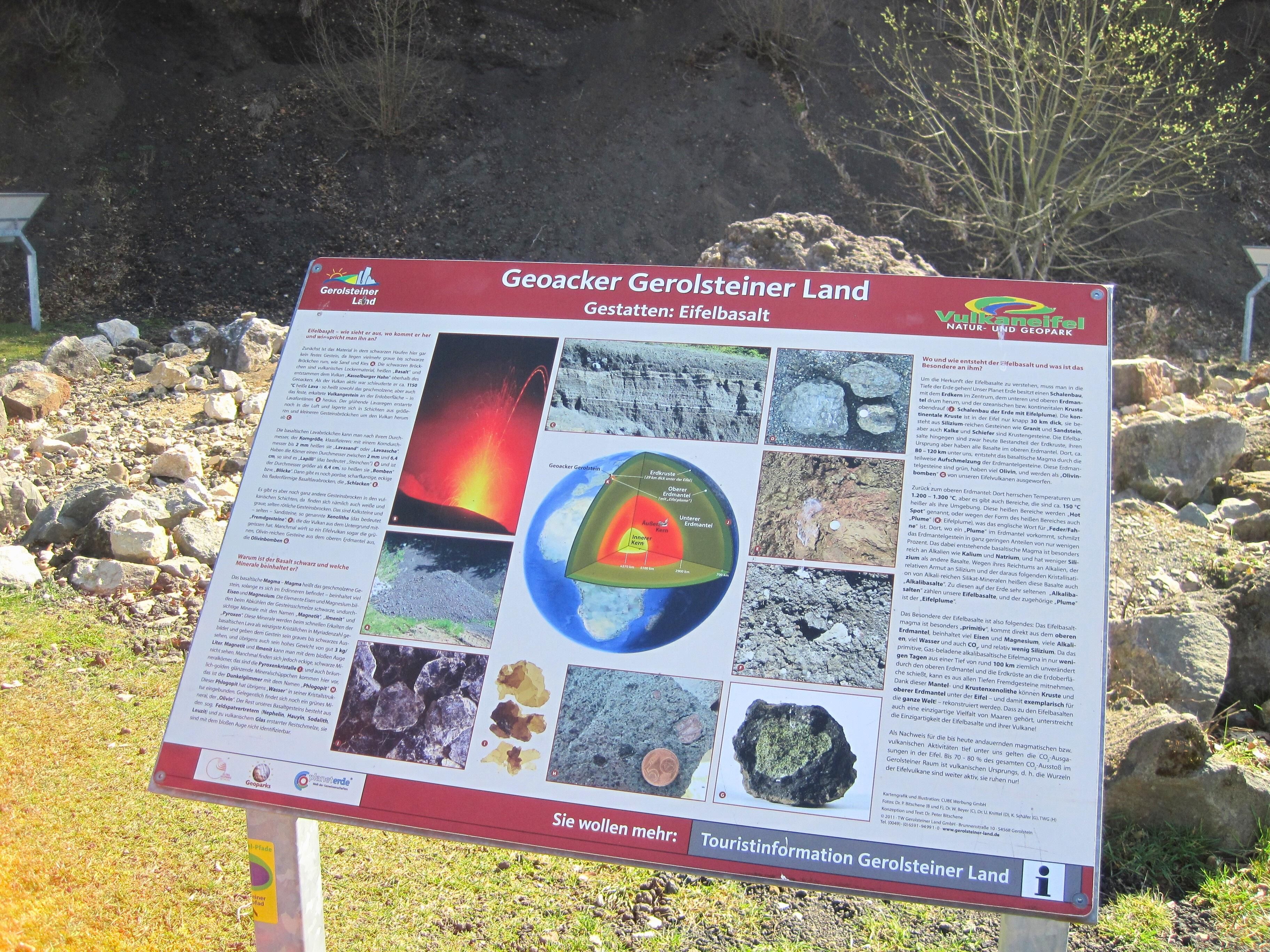 Auf dem Geoacker wurden die vier Hauptgesteinsarten der Vulkaneifel: Basalt, Kalk, Buntsandstein und Dolomit aus aktiven Steinbrüchen in der Region zusammengetragen, um Kindern hier eine Möglichkeit zu bieten, nach Herzenslust durch Hämmern, Zerbröseln und/oder Auseinanderbrechen die verschiedenen Gesteine kennenzulernen.