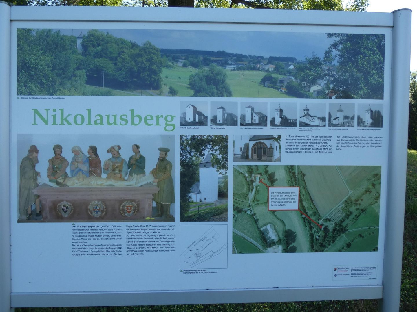 Kulturhistorisch bedeutsam ist in Spangdahlem vor allem der Nikolausberg mit seinen sieben Kreuzwegstationen und seiner Kapelle mit der bekannten Grablegungsgruppe. Zwischen den naturgeschützten alten Linden am Aufgang zur Nikolauskapelle auf dem Friedhof stehen sieben Bildstöcke aus dem 18. Jahrhundert, auch „Fußfälle“ genannt. Die Bildstöcke aus rotem Sandstein haben die Form von Heiligenhäuschen. Auf dem dachartigen Nischenkopf ist eine kleine, fünfstrahlige Rosette ausgemeißelt, die fünf Wunden Christi symbolisieren. Die Bildstöcke wurden restauriert, so dass die einzelnen Stationen gut erkennbar sind. Sie zeigen: I. die Ölbergszene, II. Jesus trägt das Kreuz, III. Jesus fällt zum ersten Mal mit dem Kreuz, IV. Jesus fällt zum zweiten Mal mit dem Kreuz, V. Kreuzigung, VI. Jesus am Kreuz, VII. Sterbeszene des Erlösers. Wenige Schritte weiter befindet sich die Nikolauskapelle, deren romanischer Turm mit der Sonnenuhr noch ein Rest der alten Nikolauskirche aus dem 12. Jahrhundert ist. In der Kapelle befinden sich drei Skulpturengruppen, die Grablegungsgruppe aus dem Jahre 1643, die Beweinungsgruppe, auch „Heiliges Grab“ genannt, und die um 1750 entstandene Auferstehungsgruppe.