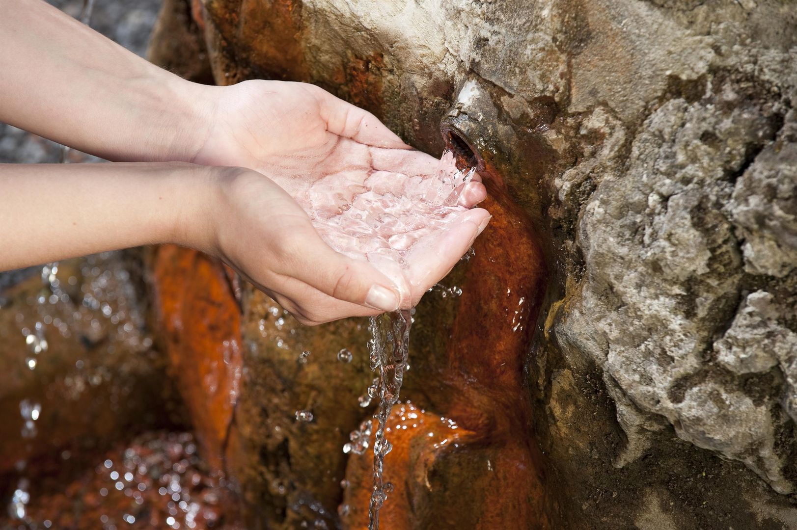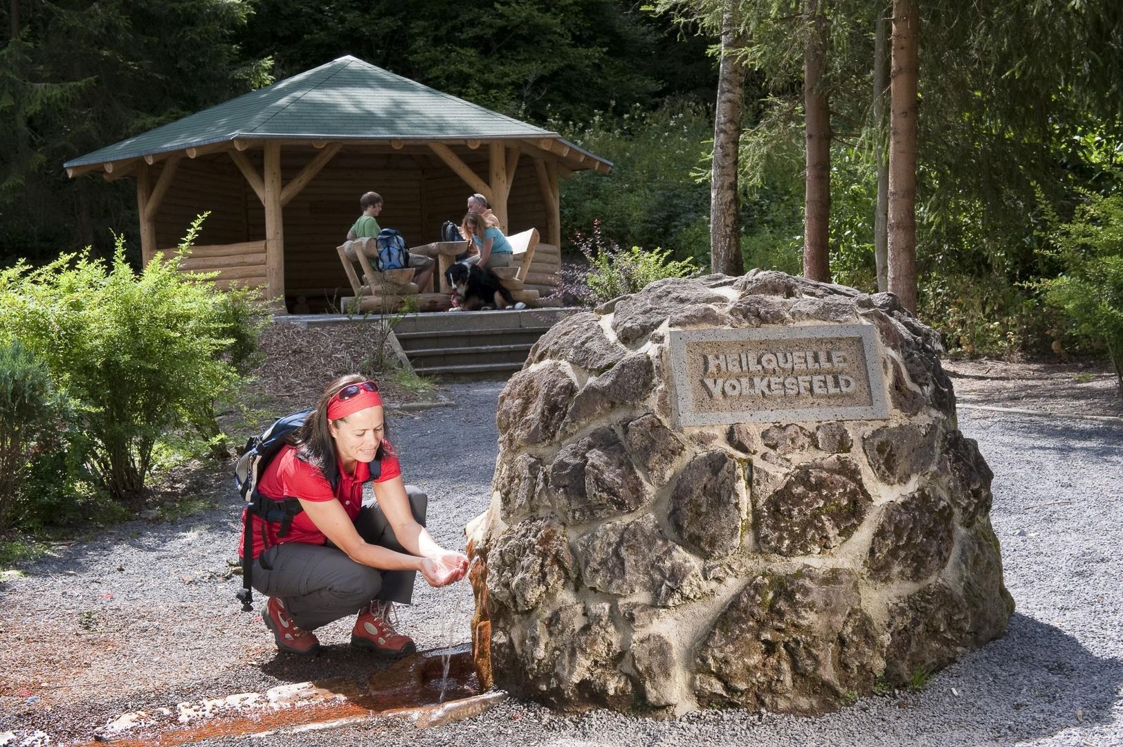 Volkesfeld Sauerbrunnen Heilquelle Koordinaten: 50“23’04“ Nord, 7°08’37“ Landkreis Mayen - Koblenz VG Mendig Anfahrt: Auf der Straße zwischen Riedener Mühle und Hausten am Hotel Forsthaus vorbei, nicht nach Volkesfeld abbiegen, rechts eine kleine geteerte Straße hoch. Anlieger frei, kann jedoch schwierig gewendet werden. Gegenüber dem Weg liegt allerdings ein Parkplatz. Ca. 200m Fußweg zum Brunnen Im Jahre 1968 wurde die 35m unter der Erde liegende Quelle gefasst und sprudelt seitdem ca. 9 Liter pro Minute aus. Bei seinem Aufstieg nimmt das Wasser aus den unterirdischen Gesteinen viele Mineralstoffe auf. Der Calcium-Magnesium-Hydrogencarbonat-Säuerling, der einer ständigen Untersuchung unterzogen wird, ist sehr reich an Mineralien wie Eisen, Calcium und Magnesium und besitzt Heilanzeichen für Magen, Darm und Galle. Der säuerliche Geschmack und die rötliche Färbung kommen durch den hohen Eisengehalt im Wasser zustande und sind kein Mangel, sondern zeichnen die Quelle als sehr wertvoll aus. Die Erstuntersuchung ergab, dass das Wasser die Voraussetzungen eines staatlich- anerkannten Heilwassers erfüllt. Auf das Anerkennungsverfahren wurde jedoch verzichtet, damit jedermann problemlos in den Genuss des gesunden Wassers kommen kann. Die gesunde Erfrischung ist kostenlos für sie. Bitte verlassen Sie die Anlage zur Freude anderer Besucher wieder so, wie Sie diese vorgefunden haben.
