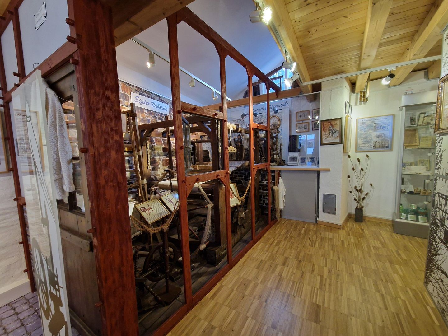 Herzstück des Ausstellungsraumes ist ein großer Webstuhl, den die Marksburg als Leihgabe zur Verfügung stellt. Dazu Höcke: „Ohne die Unterstützung der Marksburg wäre die Darstellung der Eifeler Webstube nicht möglich gewesen.“ Ein solcher Webstuhl hatte den Monrealern einen bescheidenen Wohlstand gebracht, und dessen Weiterentwicklung nahm ihnen wieder alles.