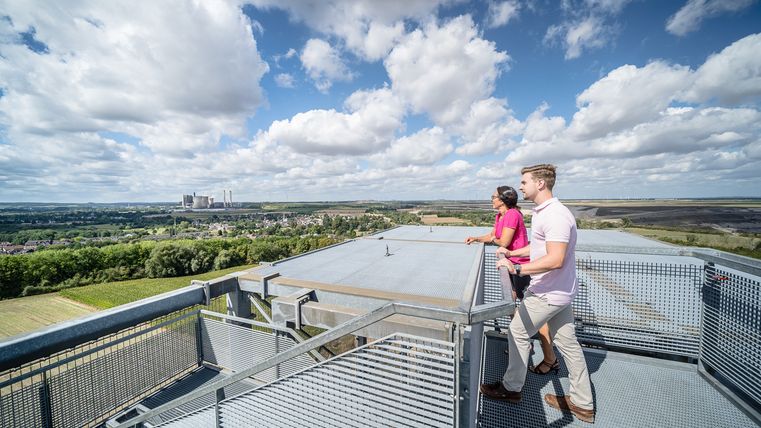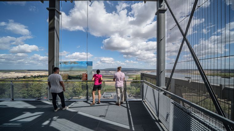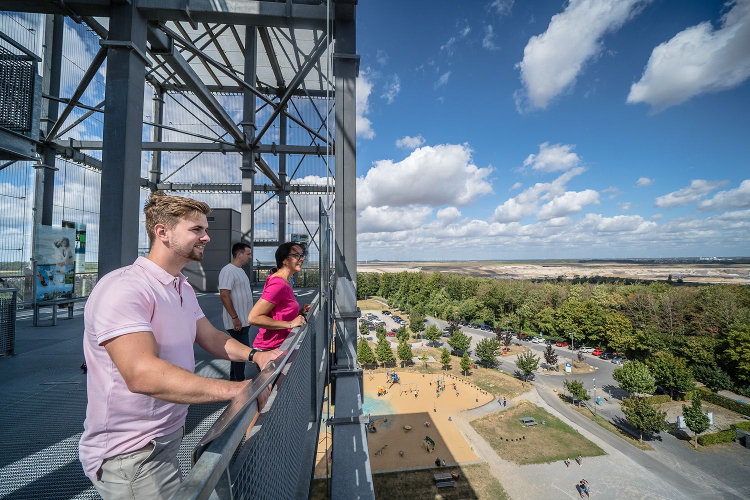 Sie haben die Wahl: Entweder Sie erklimmen den stählernen Riesen auf der Goltsteinkuppe über seine 216 Stufen oder Sie lassen sich mit dem Aufzug ganz bequem bis zur achten von zwölf Ebenen transportieren. Beim Aufstieg erfahren Sie viel Wissenswertes über die Region im Wandel und wie der Tagebau die Landschaft und die Menschen geprägt hat. Von seinen Aussichtsplattformen können Sie diesen Transformationsprozess mit eigenen Augen erleben. Nach Ende der Braunkohleförderung soll aus dem heutigen Tagebauloch ein See entstehen, mit dessen Befüllung schon in wenigen Jahren begonnen wird. Es lohnt sich also nicht nur einmal, sondern immer wieder zu kommen, um die Veränderungen hautnah zu beobachten.