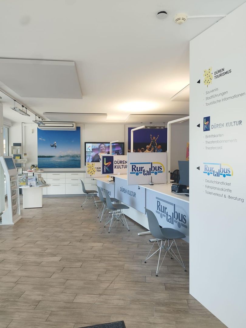 In unserer Tourismusinformation am Marktplatz in Düren erhalten Sie neben Informationen zu Ausflugstipps auch Bustickets und Konzertkarten.