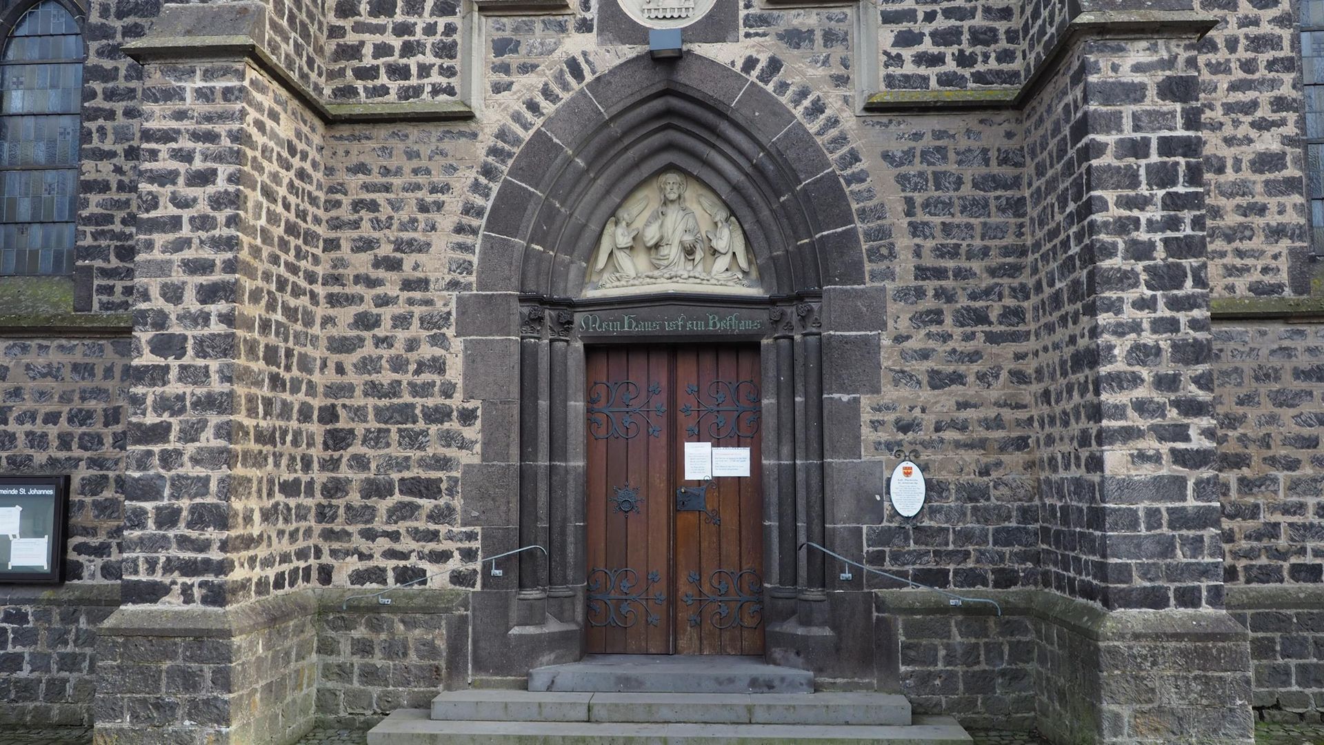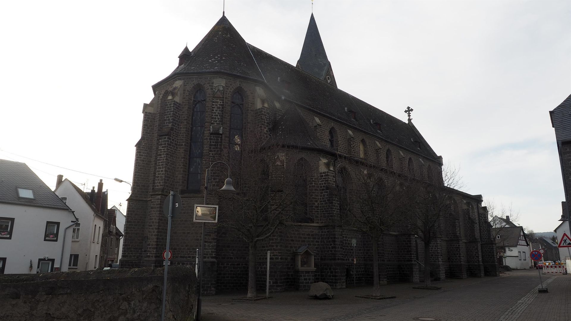 Die katholische Pfarrkirche St. Johannes Evangelist wurde 1867/68 von August Rincklage und Caspar Clemens Pickel nach 1855 erstellten Plänen des Kölner Dombaumeisters Friedrich von Schmidt errichtet. Es handelt sich um eine Basilika aus Basaltbruchstein in den Formen der doktrinären Neugotik (Dehio, Rheinland-Pfalz, 1984, S. 1017). Am 6. Mai 1867 wurde von Dechant Stadelmayer aus Mayen der Grundstein gelegt. Der im romanischen Stil erbaute Turm der alten Kirche blieb erhalten, wurde nur in Anpassung an die neue Kirche aufgestockt. (Festschrift "100 Jahre Pfarrkirche in Thür")