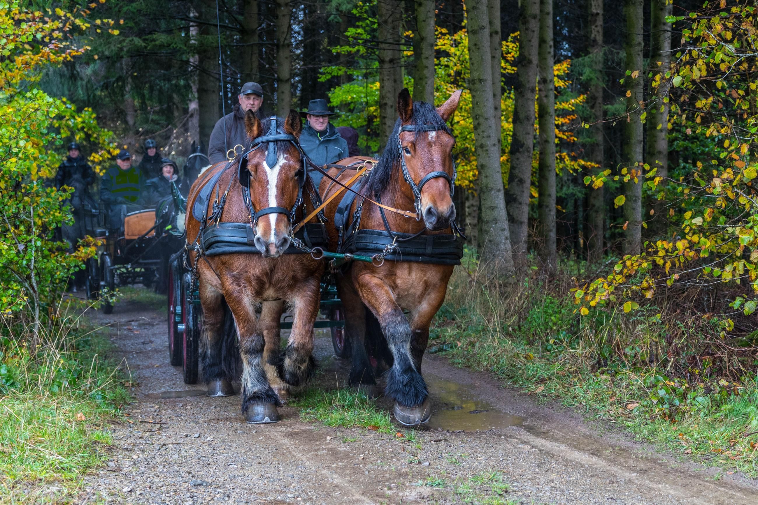 Für die Touren stehen vier Kaltblutpferde, ein Planwagen und verschiedene Kutschen zur Verfügung.