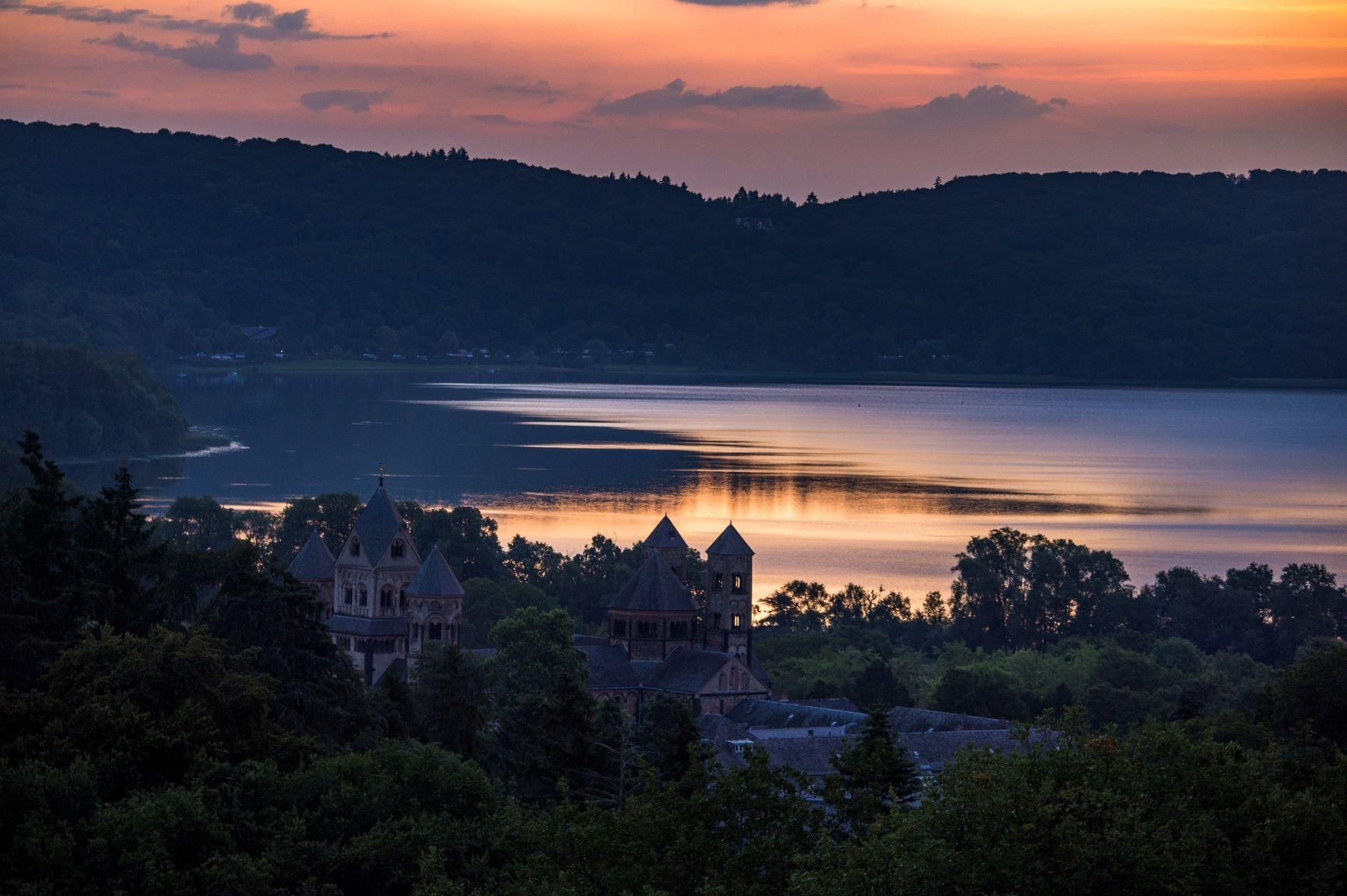 Später dann, im Laufe der Jahrtausende,füllte sich der riesige Krater schließlich mit Wasser und es entstand der Laacher See. Mit einer Größe von rund 3,3 Quadratkilometern und einer Wassertiefe von mehr als 50 Metern ist er der größte See in Rheinland-Pfalz und ein beliebtes Ausflugsziel für Badegäste, Camper und Erholungssuchende sowie Besucher der nahegelegenen Benediktinerabtei Maria Laach, zu deren Besitztümern der Laacher See gehört. Im schilfbewachsenen und von Seerosen durchzogenen Uferzonen lassen sich zudem jedes Jahr seltene Wasservögel beobachten.
