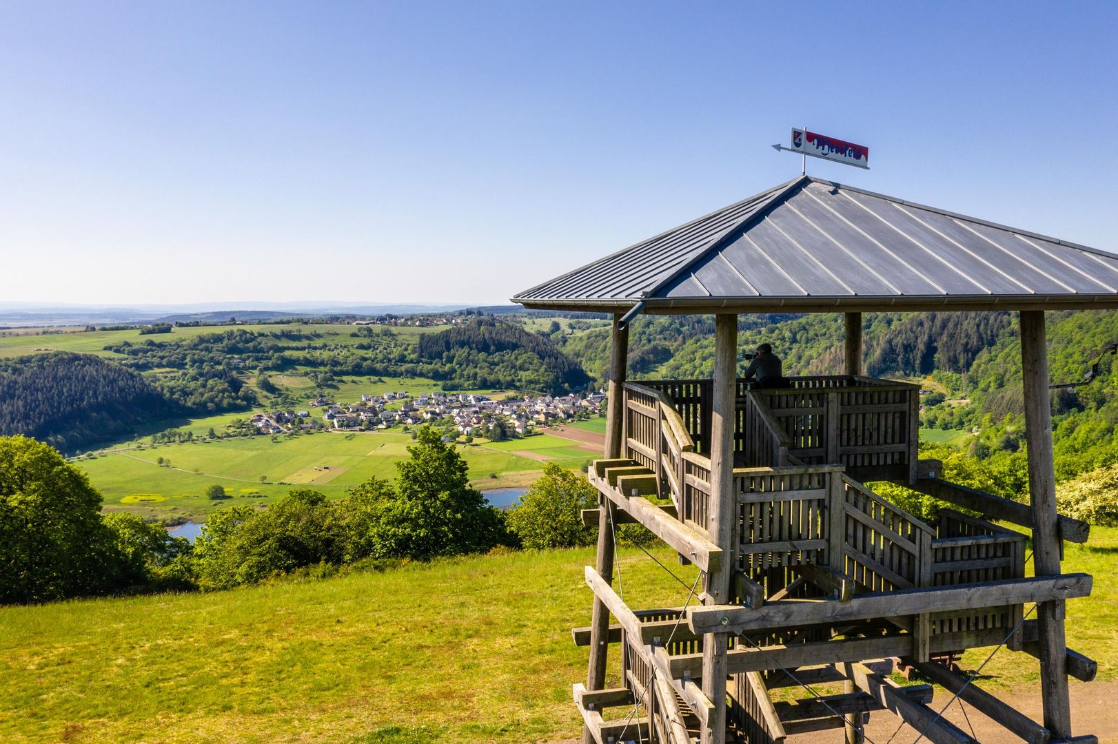Entdecke die Aussichtsplattform „Landesblick“, die hoch oben am Kraterrand thront und eine unvergessliche Aussicht auf das Umland und das Maar von Meerfeld preisgibt. Die Anstrengungen des Aufstiegs auf 515 Meter über NN lohnen sich, denn die Weitsicht in alle Himmelsrichtungen ist fantastisch. Bänke unterhalb des Turms sind hervorragend für ein Picknick während einer Wanderung geeignet.