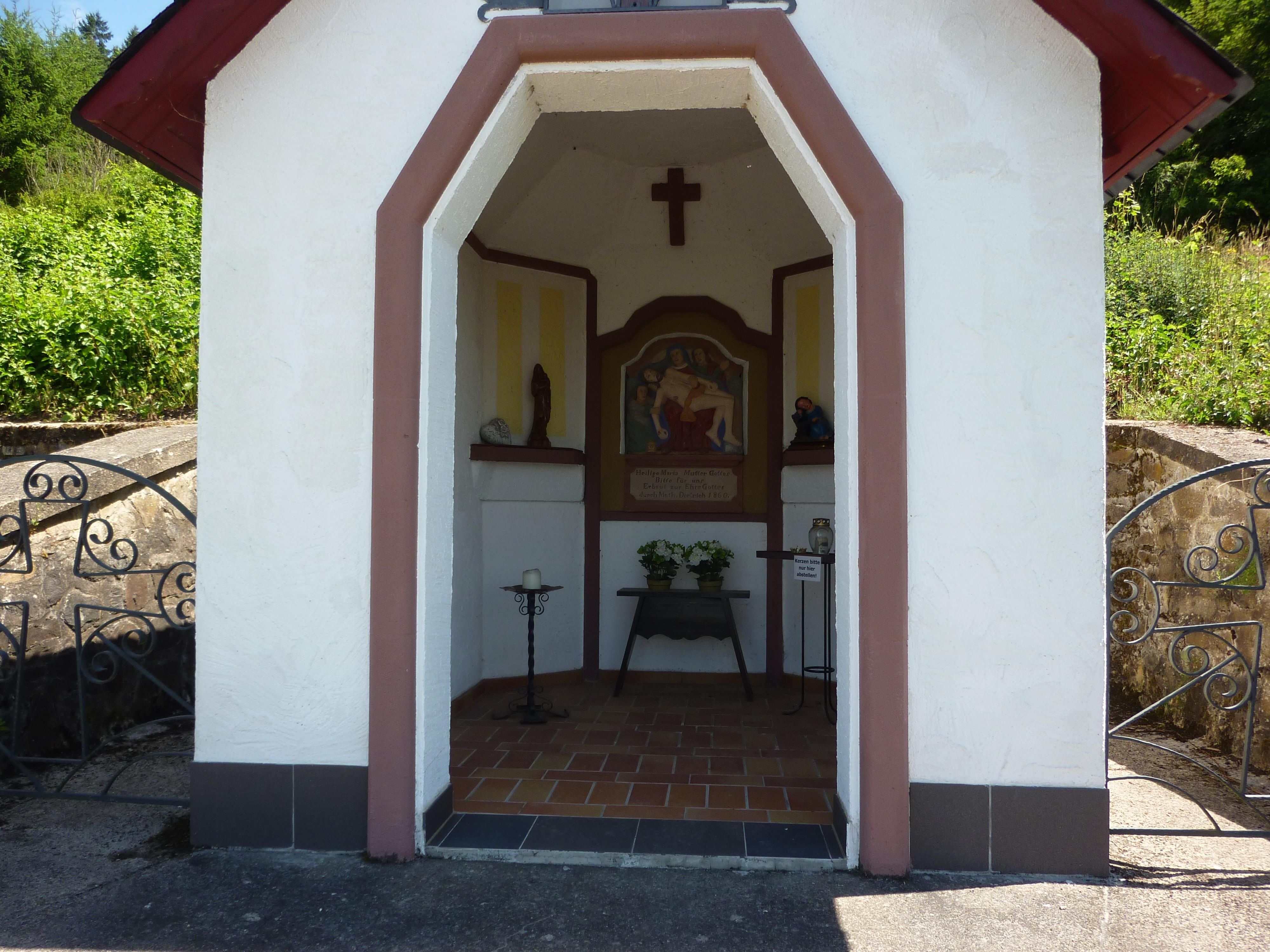 Schöne Marienkapelle, 1860 errichtet, ein Blickfang. Ein Relief der schmerzhaften Mutter Gottes ist zu sehen, davor ein Holztischchen mit Blumen und Kerzen. Der Platz ist schön hergerichtet mit Ruhebank neben der Kapelle.