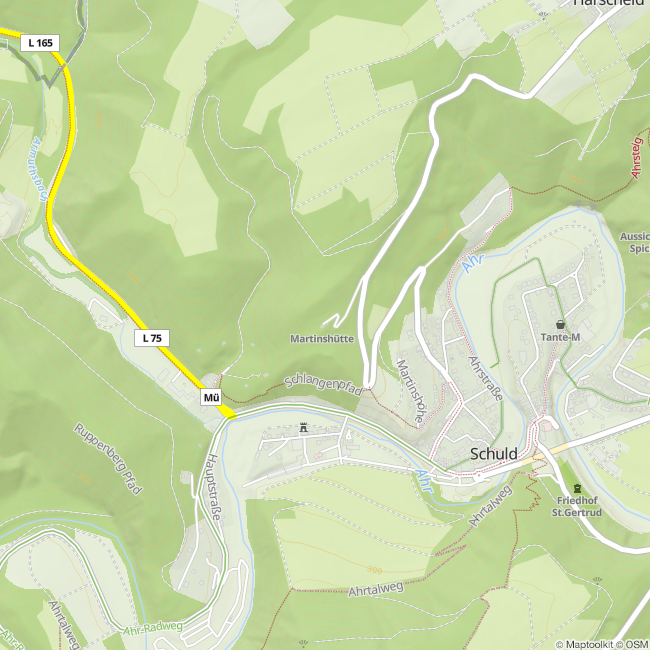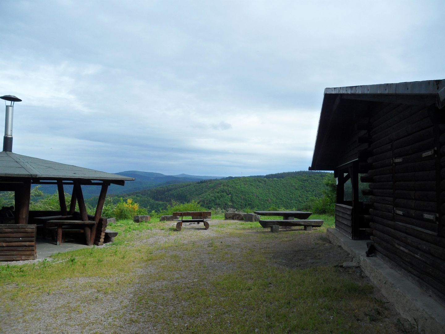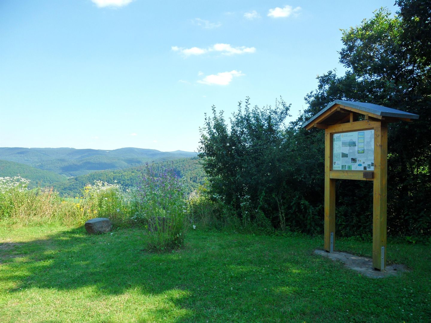 Von der Hüttenanlage aus genießen Besucher einen beeindruckenden Panoramablick über den Ahrbogen, den Ort Schuld sowie über die Eifelhöhen mit der Hohen Acht.
