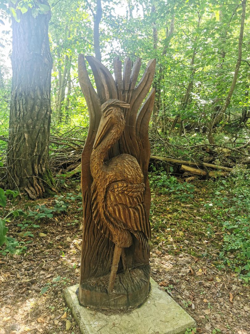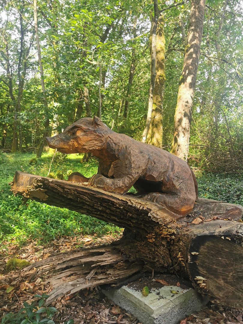 Handgefertigte Holzskulpturen lokaler Tiere, wie z.B. Rotwild, Wildschweine, Füchse, Uhus und Rehe, sind auf dem Gelände des Rastplatzes verteilt. Die Figuren sind in natürlicher Größe oder leicht überdimensioniert, um Kinder und Erwachsene gleichermaßen zu beeindrucken und die Artenvielfalt der Region greifbar zu machen.
