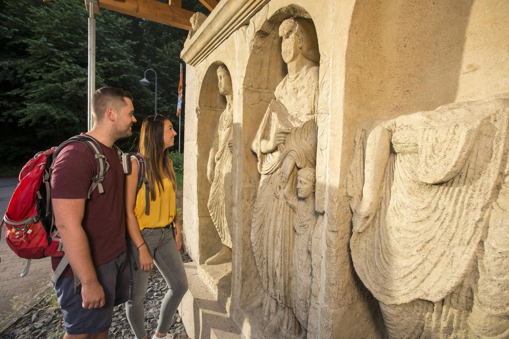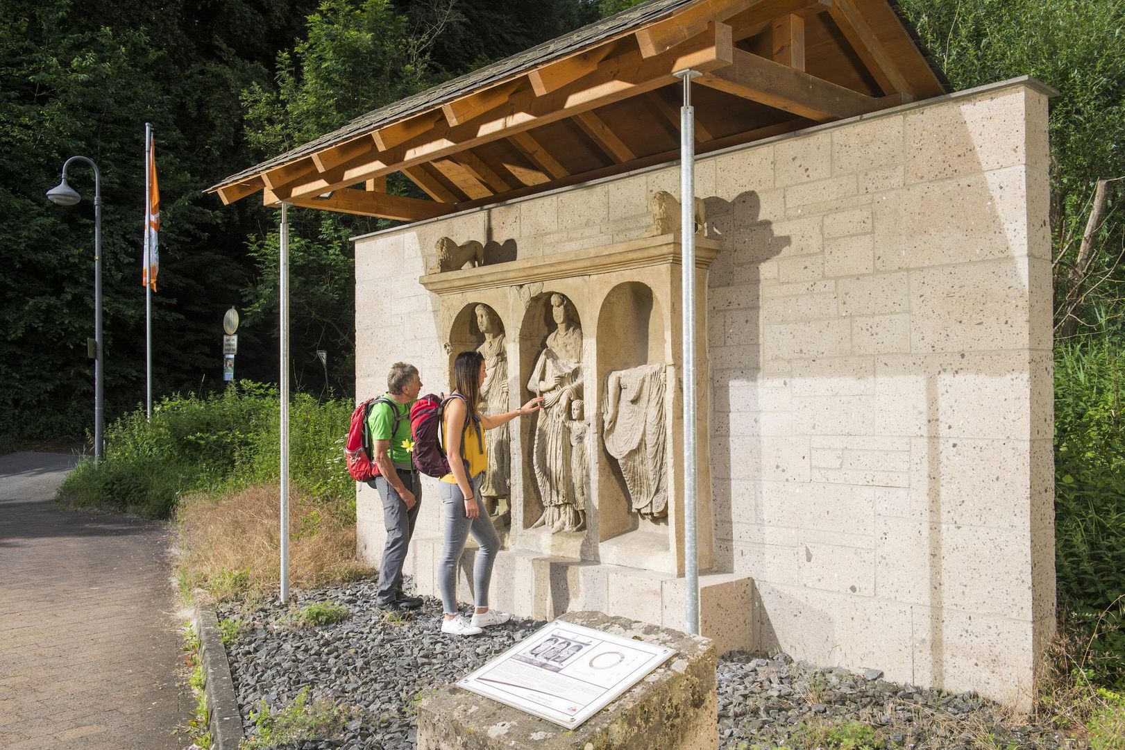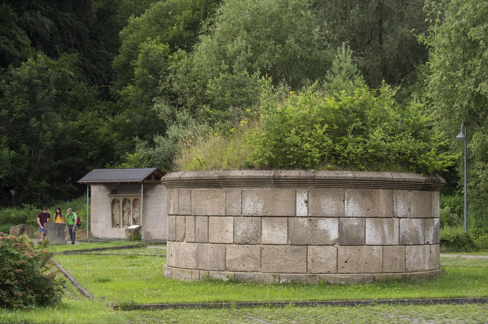 Es waren wohl sehr wohlhabende Gutsbesitzer, die sich hier vor rund 2.000 Jahren ein langes Andenken sichern wollten. Das ist ihnen zweifellos gelungen! Der Grabhügel mit Tuffstein-Mauer erinnert laut lateinischer Inschrift an Contuinda und ihren Sohn Silvanus Ategnisa. Beide Namen sind keltischen Ursprungs und belegen, dass die Kelten zwar die römische Kultur angenommen hatten, aber auch ihren angestammten Wurzeln treu blieben. Das gleiche verraten die Figuren im Nischengrabmal, denn keltische und römische Bekleidung, Schmuck und Haartracht werden hier selbstbewusst gemischt. Beide Männer tragen eine römische Bürgerrechtsrolle in der Hand. Gelebt haben die Toten wohl auf einem Gutshof ganz in der Nähe.