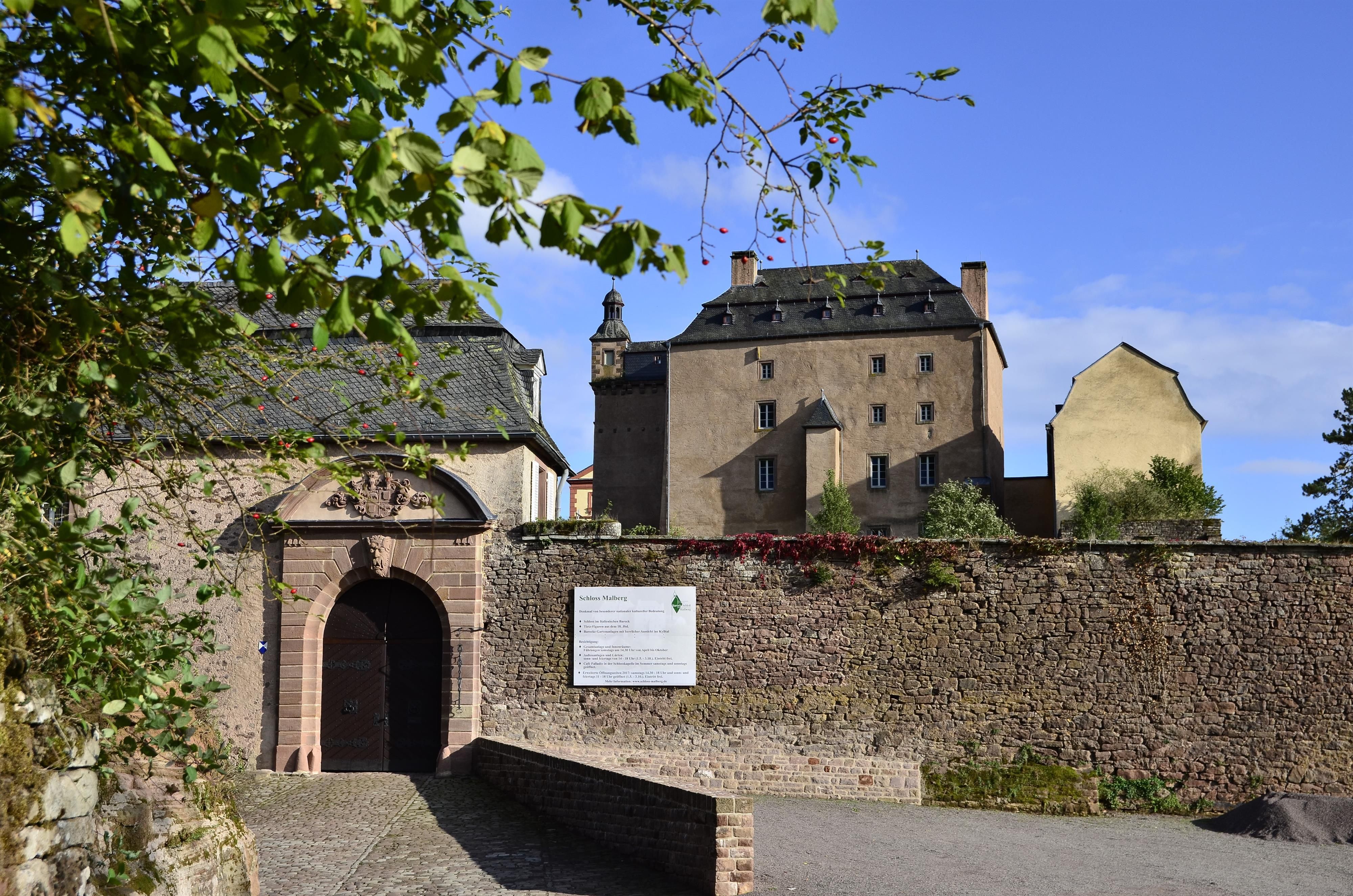 Die einzigartige Schlossanlage Malberg besteht aus dem sogenannten Neuen Haus, dem Alten Haus, dem Arkadenbau, der Brauerei und der Kapelle. Weiter gehören der "Eiserne Garten" und der "Runde Garten" zu dem auf einem Bergsporn gelegenen Schloss. Das Schloss Malberg geht auf eine Burg zurück, die schon im Jahre 1008 erwähnt wird. Von dem mittelalterlichen Bau ist nichts erhalten. 1681 übernimmt die Familie Veyder die Burg und läßt sie von 1708 bis 1715 durch Matteo Alberti, einem Architekten aus Venedig, zu einem Schloss im Stil des venezianischen Barock ausbauen. Die repräsentativen Gebäude enthalten Stuckdecken und Holztäfelungen sowie Gobelins und alte Möbel. Einzigartig ist eine bemalte Wandbespannung mit Jagdszenen. Im Schloss kann man sich standesamtlich trauen lassen. Das Schloss ist nicht barrierefrei. Hunde sind im Schloss nicht erlaubt.