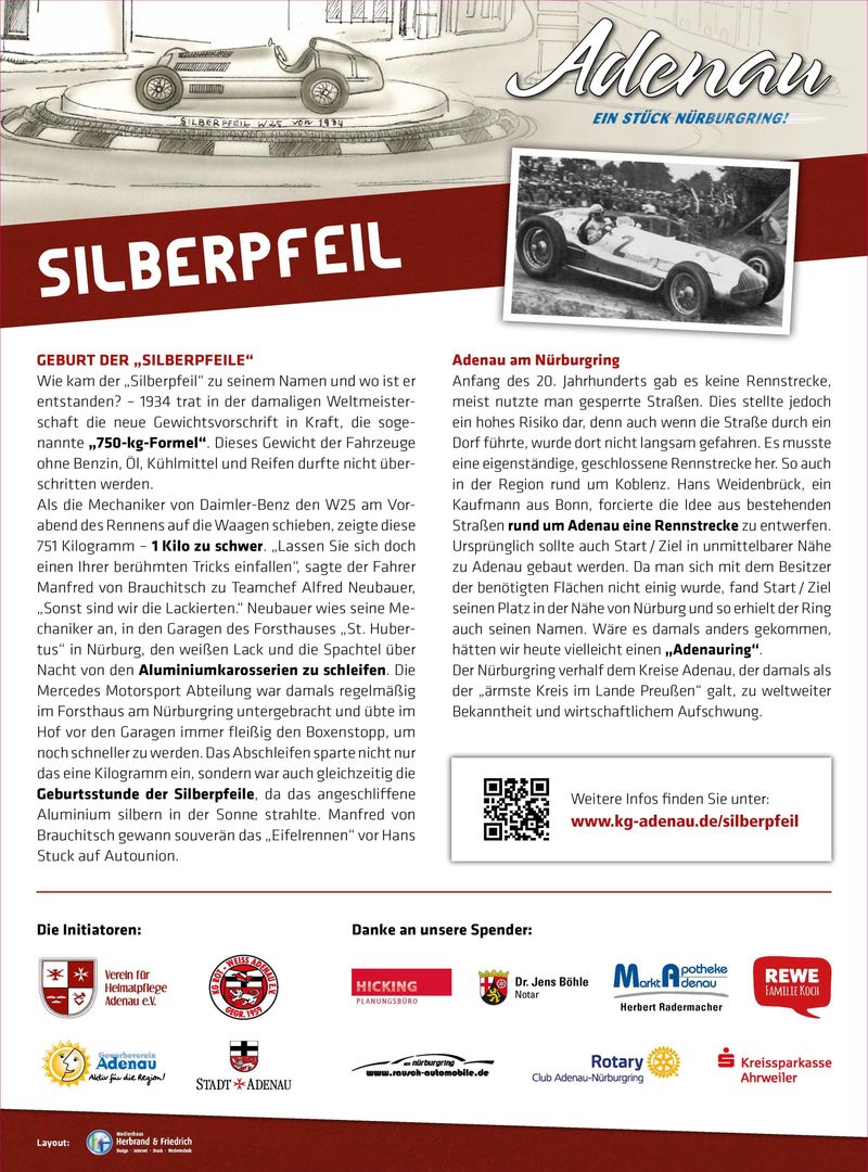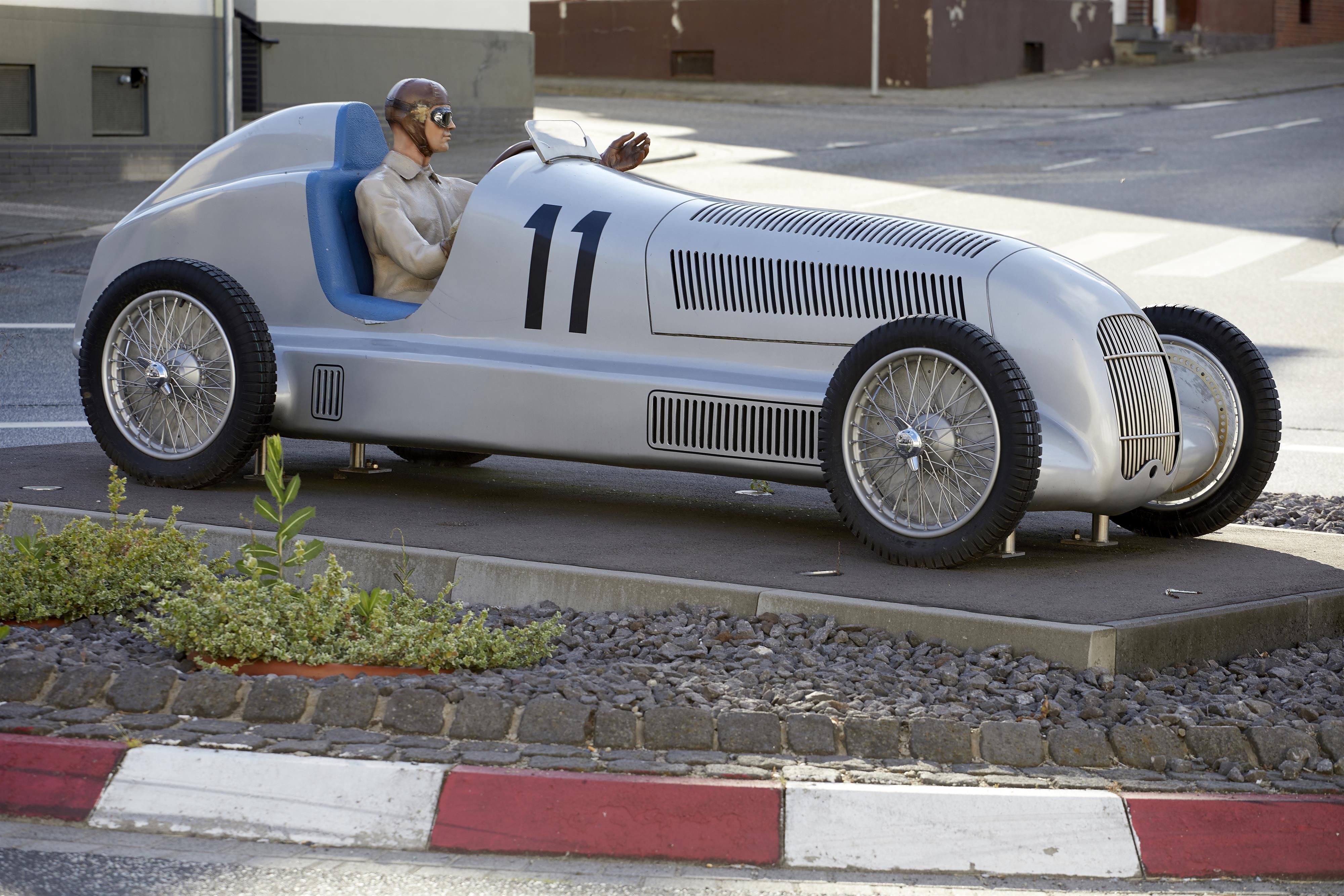 Neubauer wies seine Mechaniker an, in den Garagen des Forsthauses „St. Hubertus“ in Nürburg, den weißen Lack und die Spachtel über Nacht von den Aluminiumkarosserien zu schleifen. Die Mercedes Motorsport Abteilung war damals regelmäßig im Forsthaus am Nürburgring untergebracht und übte im Hof vor den Garagen immer fleißig den Boxenstopp, um noch schneller zu werden. Das Abschleifen sparte nicht nur das eine Kilogramm ein, sondern war auch gleichzeitig die Geburtsstunde der Silberpfeile, da das angeschliffene Aluminium silbern in der Sonne strahlte. Manfred von Brauchitsch gewann souverän das „Eifelrennen“ vor Hans Stuck auf Autounion. Adenau am Nürburgring Anfang des 20. Jahrhunderts gab es keine Rennstrecke, meist nutzte man gesperrte Straßen. Dies stellte jedoch ein hohes Risiko dar, denn auch wenn die Straße durch ein Dorf führte, wurde dort nicht langsam gefahren. Es musste eine eigenständige, geschlossene Rennstrecke her. So auch in der Region rund um Koblenz. Hanns Weidenbrück, ein Kaufmann aus Bonn, forcierte die Idee aus bestehenden Straßen rund um Adenau eine Rennstrecke zu entwerfen. Ursprünglich sollte auch Start / Ziel in unmittelbarer Nähe zu Adenau gebaut werden. Da man sich mit dem Besitzer der benötigten Flächen nicht einig wurde, fand Start / Ziel seinen Platz in der Nähe von Nürburg und so erhielt der Ring auch seinen Namen. Wäre es damals anders gekommen, hätten wir heute vielleicht einen „Adenauring“. Der Nürburgring verhalf dem Kreise Adenau, der damals als der „ärmste Kreis im Lande Preußen“ galt, zu weltweiter Bekanntheit und wirtschaftlichem Aufschwung.