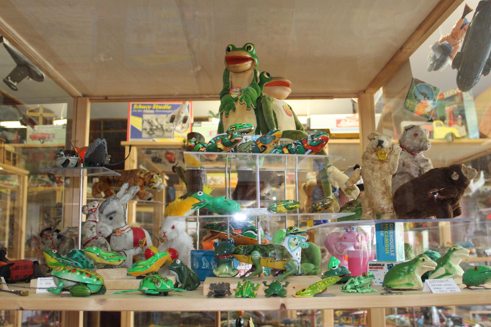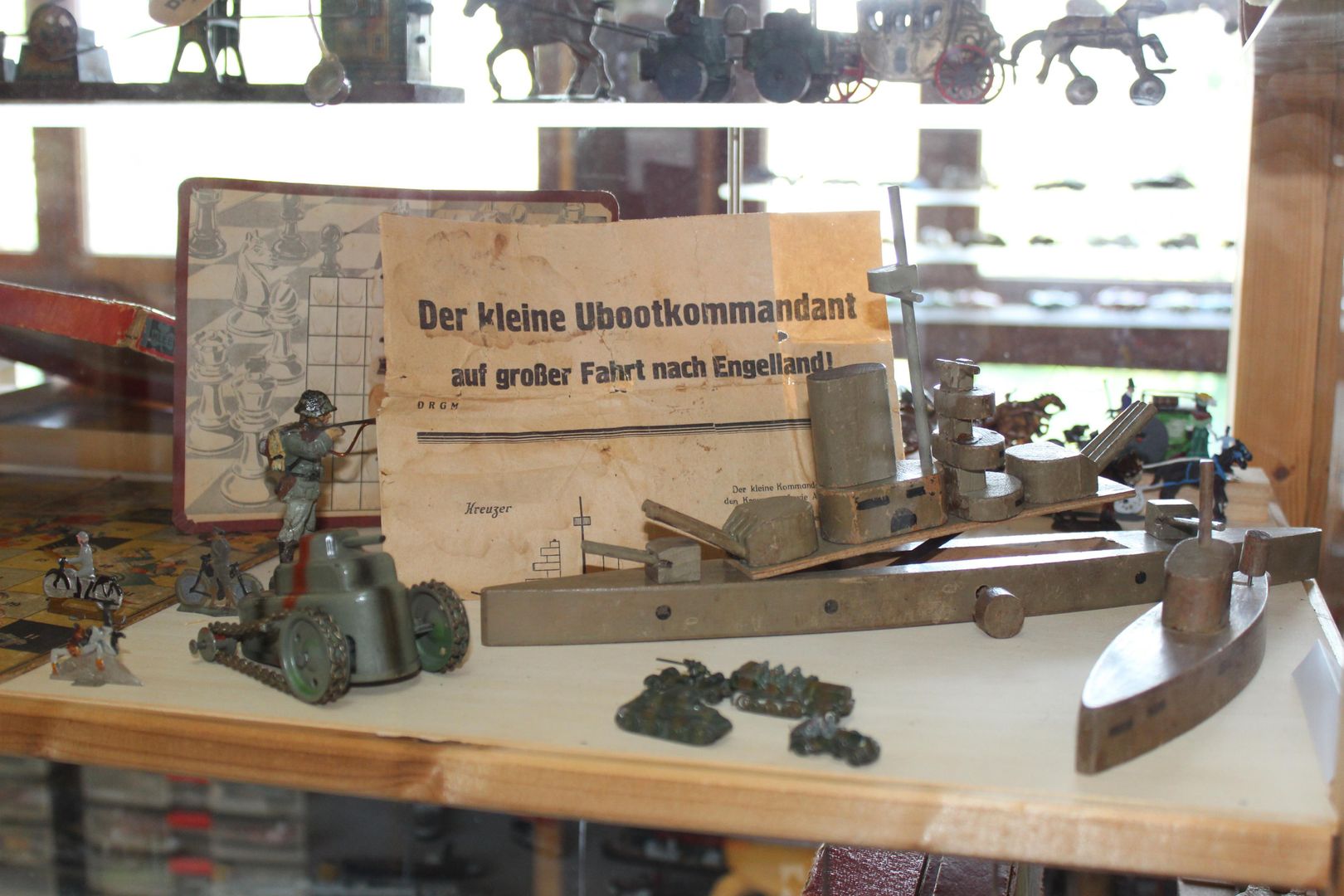 jahrelanger Sammlertätigkeit auf Flohmärkten zusammengetragen und vieles liebevoll restauriert. Schwerpunkt bilden mechanisches Spielzeug und Figuren zum Aufziehen, Slot-car Automodelle, zum Teil selbst gebaut, aber auch Ritterburgen, Ritter- und Indianerfiguren, Tiere aus Masse und Kunststoff. Eisenbahnen, Autobahnen, Blechspielzeug, Nähmaschinen, Gesellschaftsspiele sind auch zu finden, so dass sich mancher Besucher in seine Kindheit zurückversetzt fühlt.