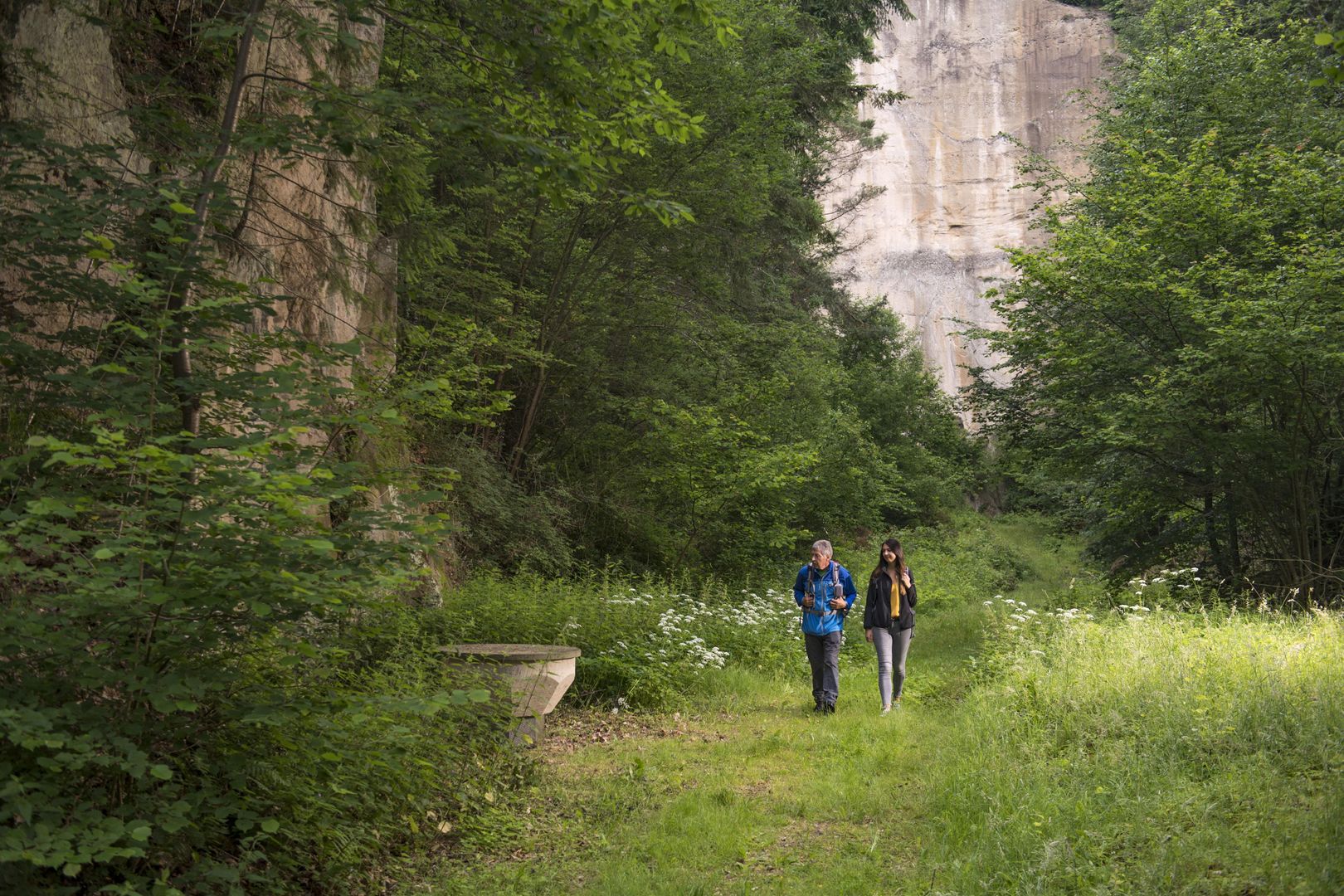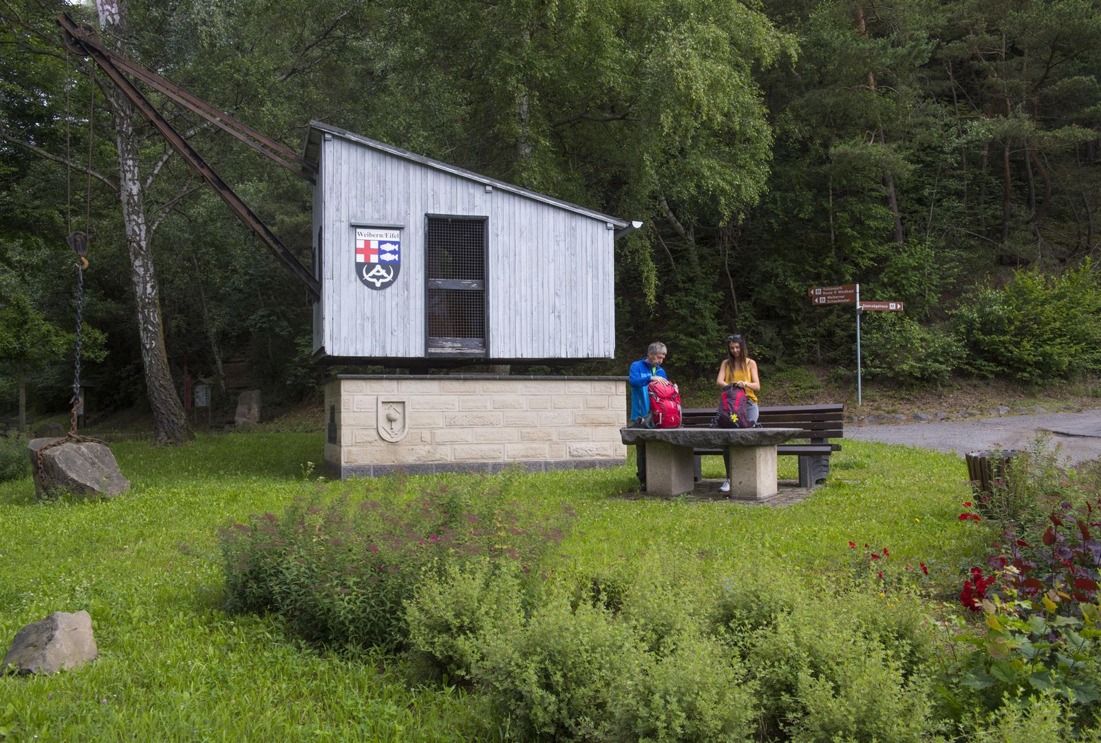Wer mehr über Tuff erfahren möchte, kann sich hier links im „Weiberner Schaufenster“ über dieses Gestein und seine Verwendungsmöglichkeiten informieren. Der Weg rechts hinauf führt Sie zudem in nur wenigen Minuten zur Freiluftausstellung am Steinsägehaus, wo unter anderem eine Steinsäge und ein Kran anschaulich die Arbeitsprozesse rund um den Werkstein Tuff verdeutlichen.