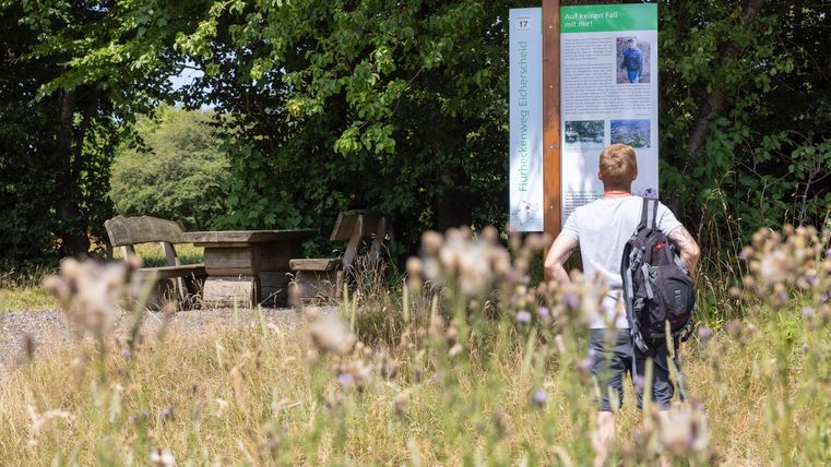 Mit Kleinkind unterwegs? Die Strecke lässt sich an Station 4 (Grünes Klassenzimmer) auch abkürzen. Hierzu könnt ihr einfach über die Buschgasse und den Pfad am Spielplatz entlang zum Ausgangspunkt zurückkehren. Noch eine gute Nachricht für Familien: Der gesamte Weg ist – mit kleinen, aber auch etwas steilen Anstiegen (bis ca. 12%) – kinderwagenfreundlich asphaltiert, sodass auch die Kleinsten am Erlebnis Flurheckenweg teilhaben können.
