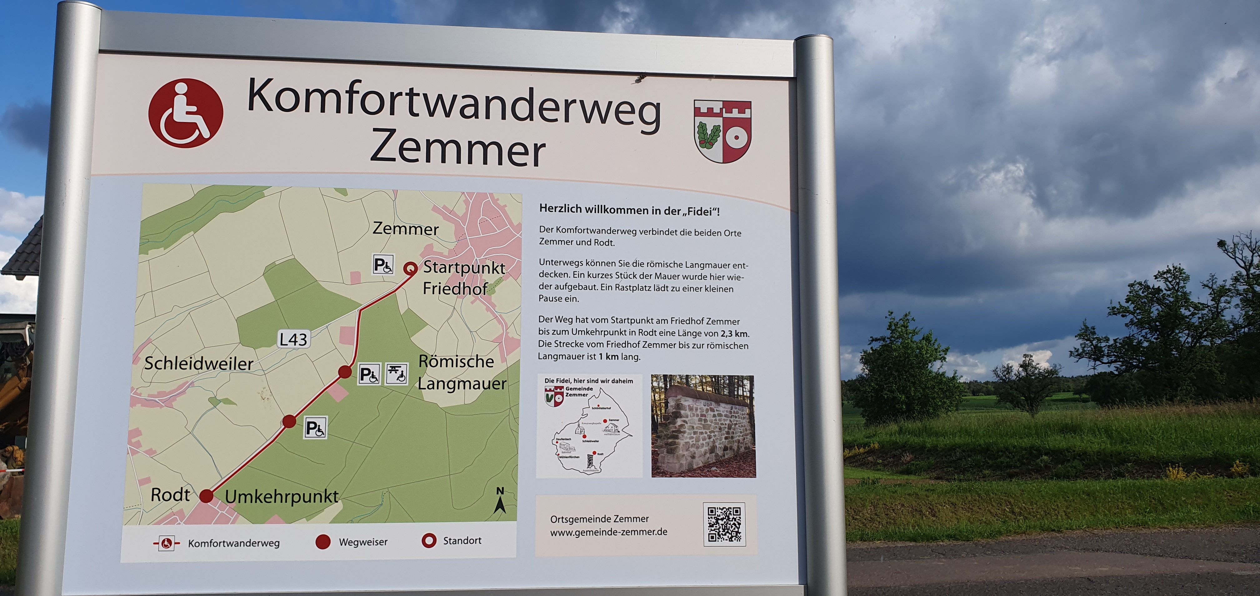 Der barrierefreie Stichweg zwischen Zemmer und Rodt liegt in unmittelbarer Nähe zum Eifelsteig und führt entlang von Feld und Flur, am Waldrand. Unterwegs trifft der Wanderweg nicht nur auf ein Teilstück der römischen Langmauer, sondern auch auf dem Walderlebnispfad.