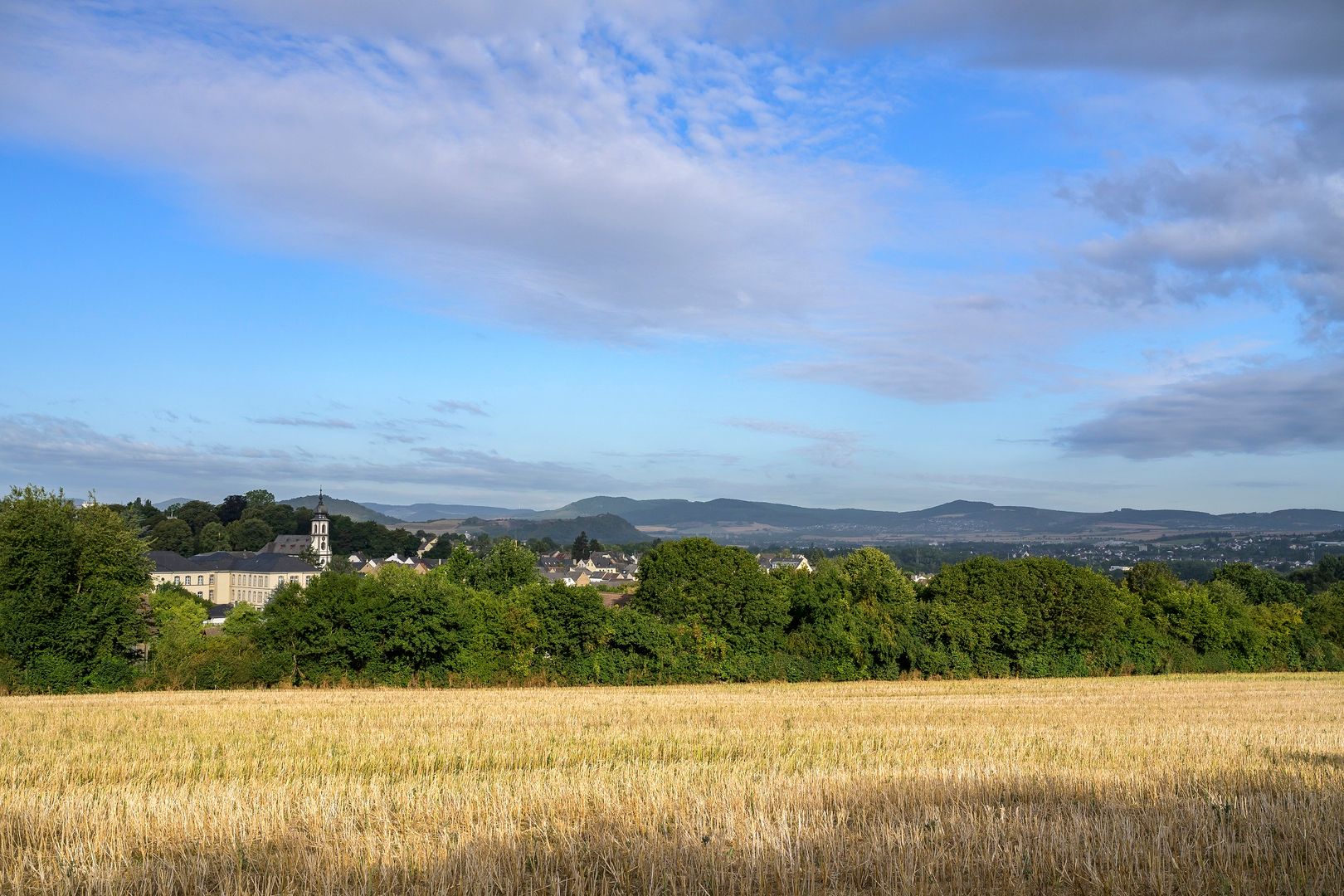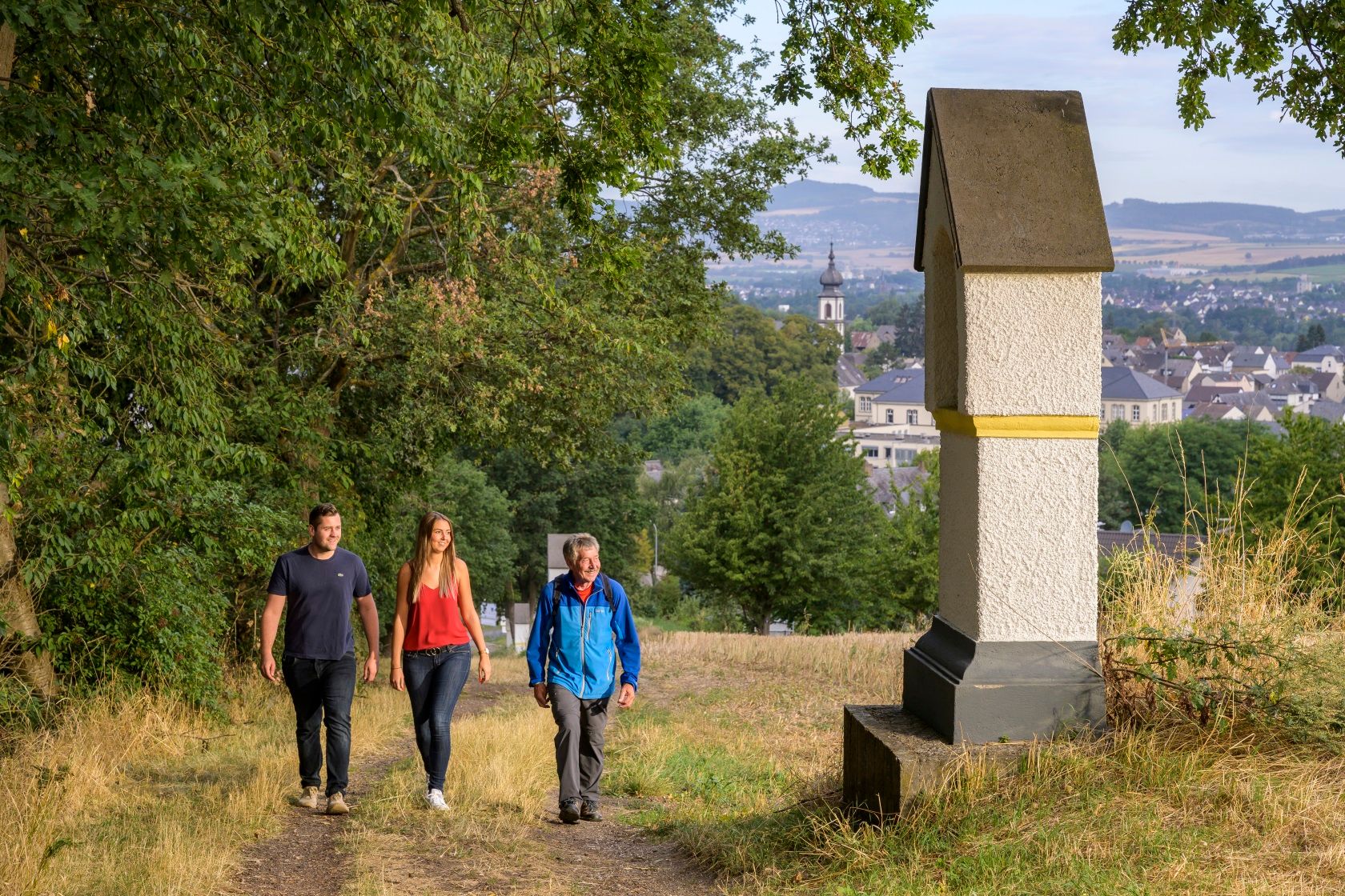 Am Dorfplatz nehmen Sie die Hauptstraße bergab, vorbei an der beeindruckenden Barockkirche St. Cäcilia, bis zum Friedhof. Der Friedhofstraße folgend, werden Sie auf ein Feldweg geleitet, der am Ende kurz ansteigt. An der Unterführung halten Sie sich links und biegen den nächsten Weg direkt wieder links ab. Durch idyllische Felder führt Sie der Weg bis zur Landstraße (L123), an der Sie ein kleines Stück entlanglaufen und diese dann überqueren. Auf Feldwegen geht es weiter, wobei Sie sich an der kommenden Gabelung links halten. Dem Weg folgend, werden Sie hinab auf eine Wiese in ein kleines Wäldchen geleitet. Dort erblicken Sie eine imposante „Säulenhallen“. Entlang an zahlreichen Bildstöcken geht es weiter den „Kreuzberg“ hinab, wobei Sie den zweiten Weg rechts einbiegen. Auf dem folgenden Fußweg haben Sie eine schöne Aussicht auf den Ort sowie die Barrockkirche. Am Ende des Weges halten Sie sich zweimal links und folgen dem Pfad entlang einer Wiese in einen kleinen Park. Diesen durchqueren Sie und gelangen so auf die Pöschstraße. Halten Sie sich dort rechts, bevor Sie links auf die Neuwieder Straße abbiegen, die zurück zum Dorfplatz führt.