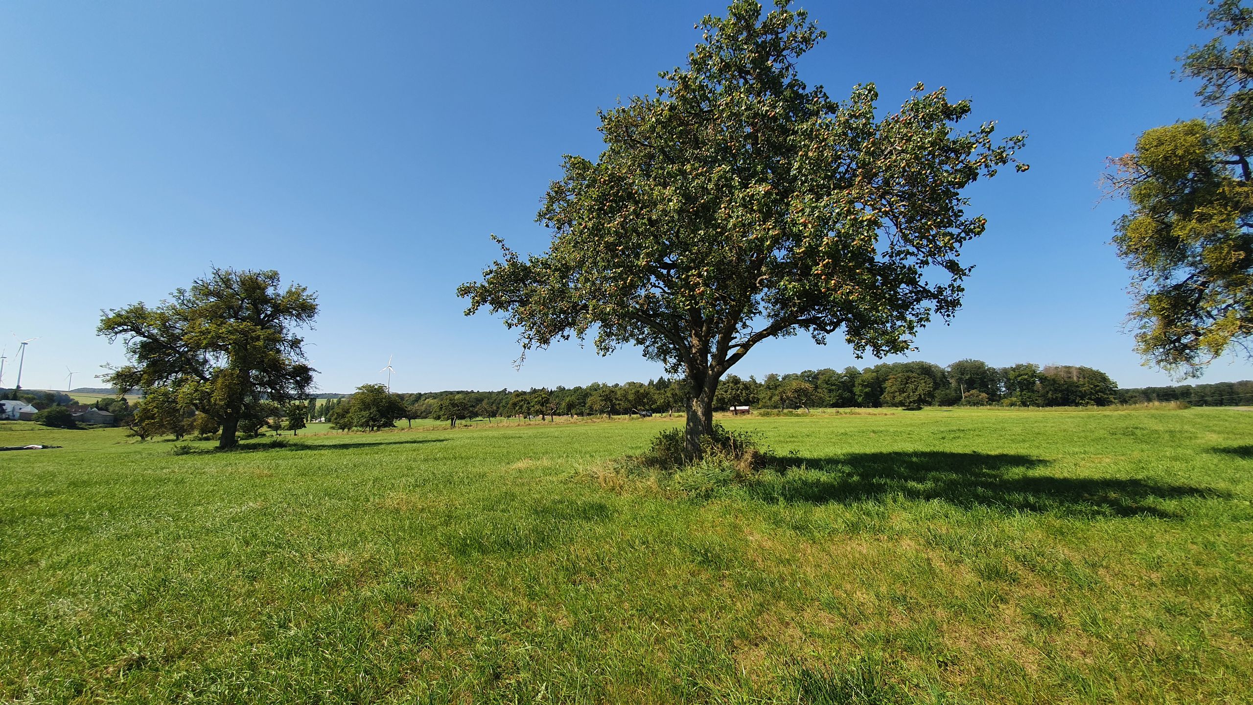Von hier aus haben Sie einen herrlichen Blick über eine Streuobstwiese. Besonders im Frühjahr ein großartigen Anblick, wenn die Bäume am Aufblühen sind.