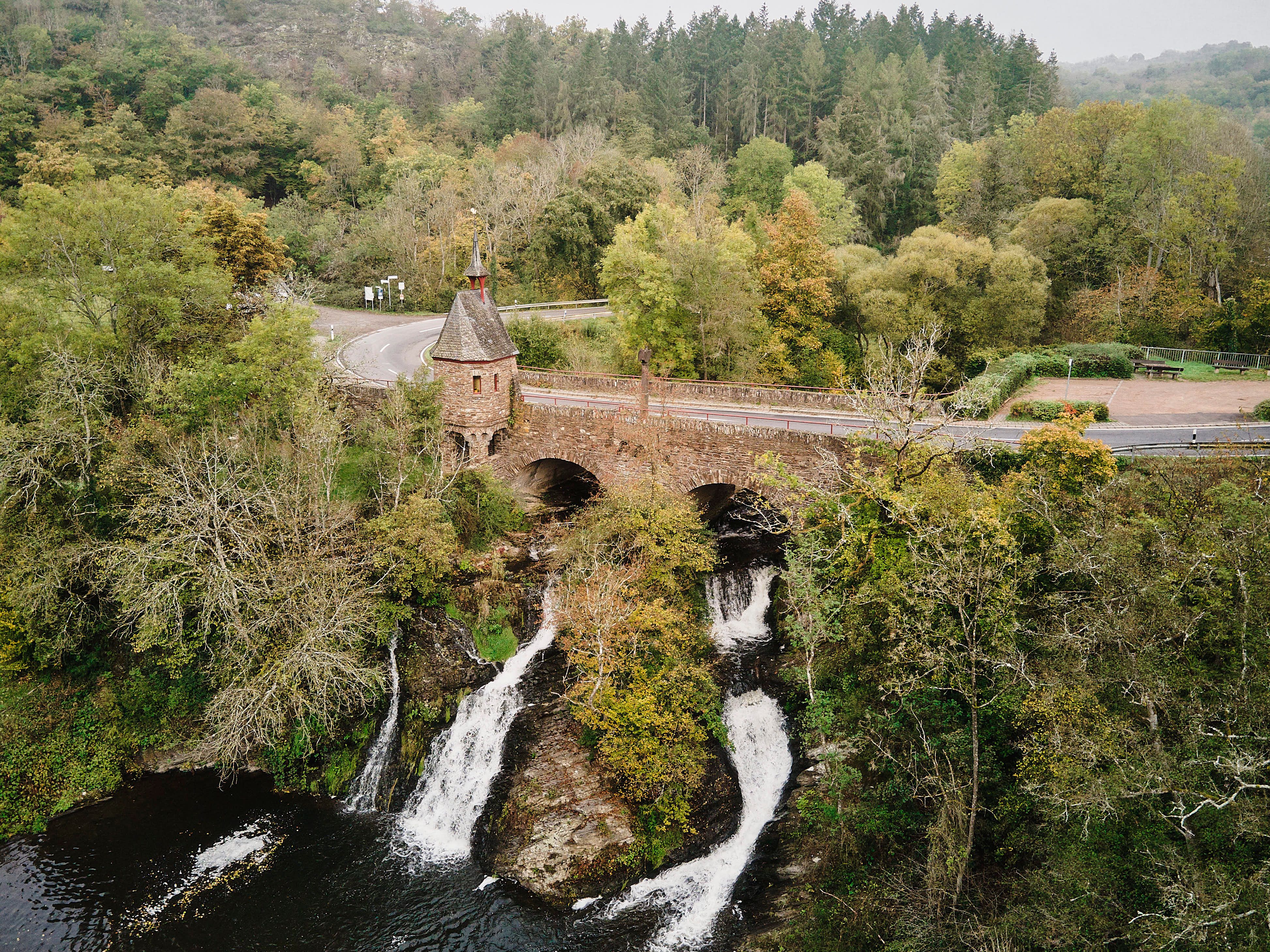 Am Rande des "Forster Kirchspiels" überragt die wieder aufgebaute Burg Pyrmont den dreigeteilten Wasserfall der Elz. Seit dem 01. Mai 1990 ist die Burg Pyrmont für Besucher geöffnet (bitte beachten Sie hier die Öffnungszeiten). Der älteste erhaltene Teil ist der 25 m hohe romanische Bergfried, von dem man einen herrlichen Blick über das Maifeld bis hin zur Burg Eltz hat. Der Weg führt nun zur Pyrmonter Mühle, wo Sie einen traumhaften Blick auf den Wasserfall und die Burg Pyrmont haben.