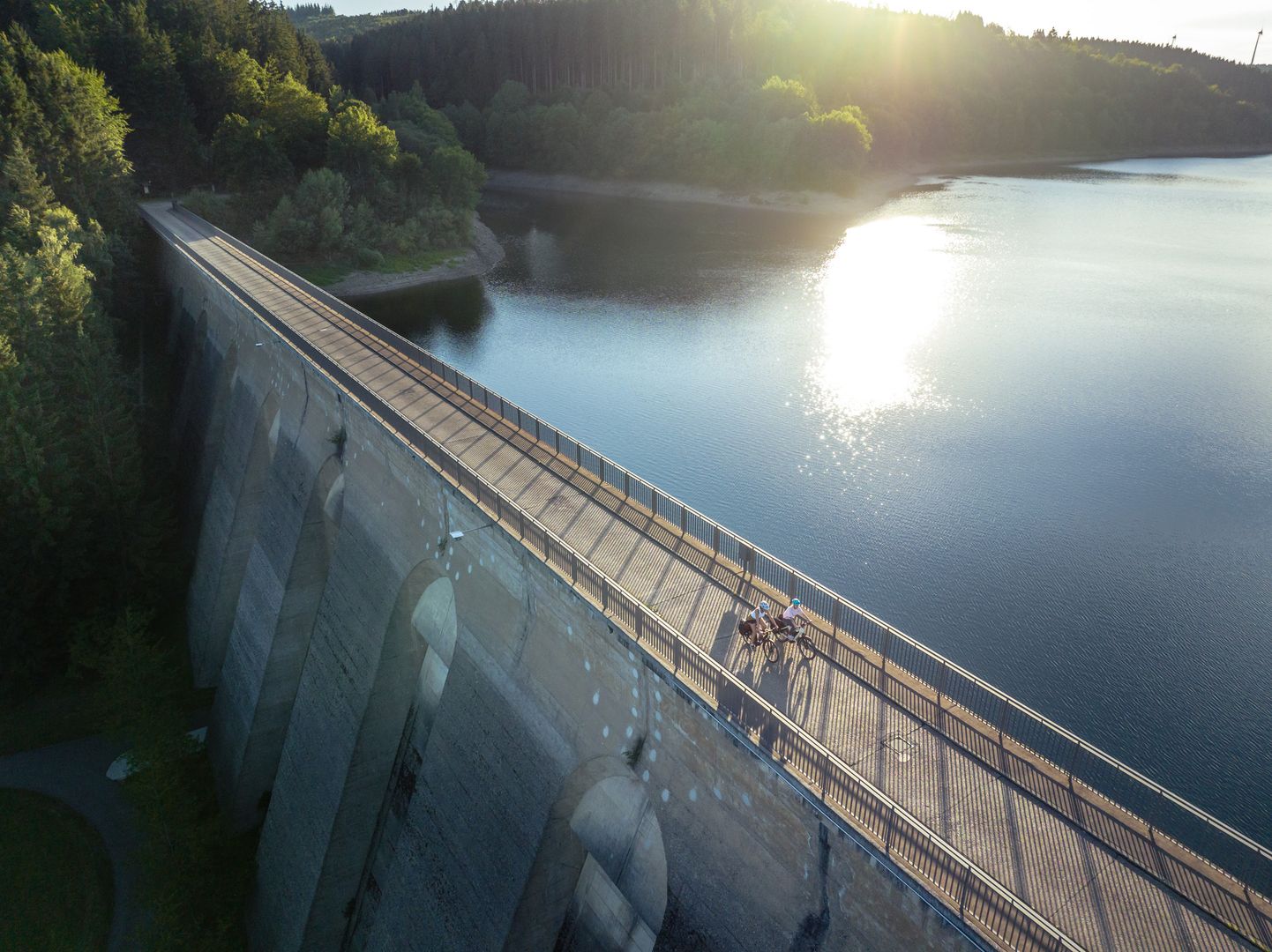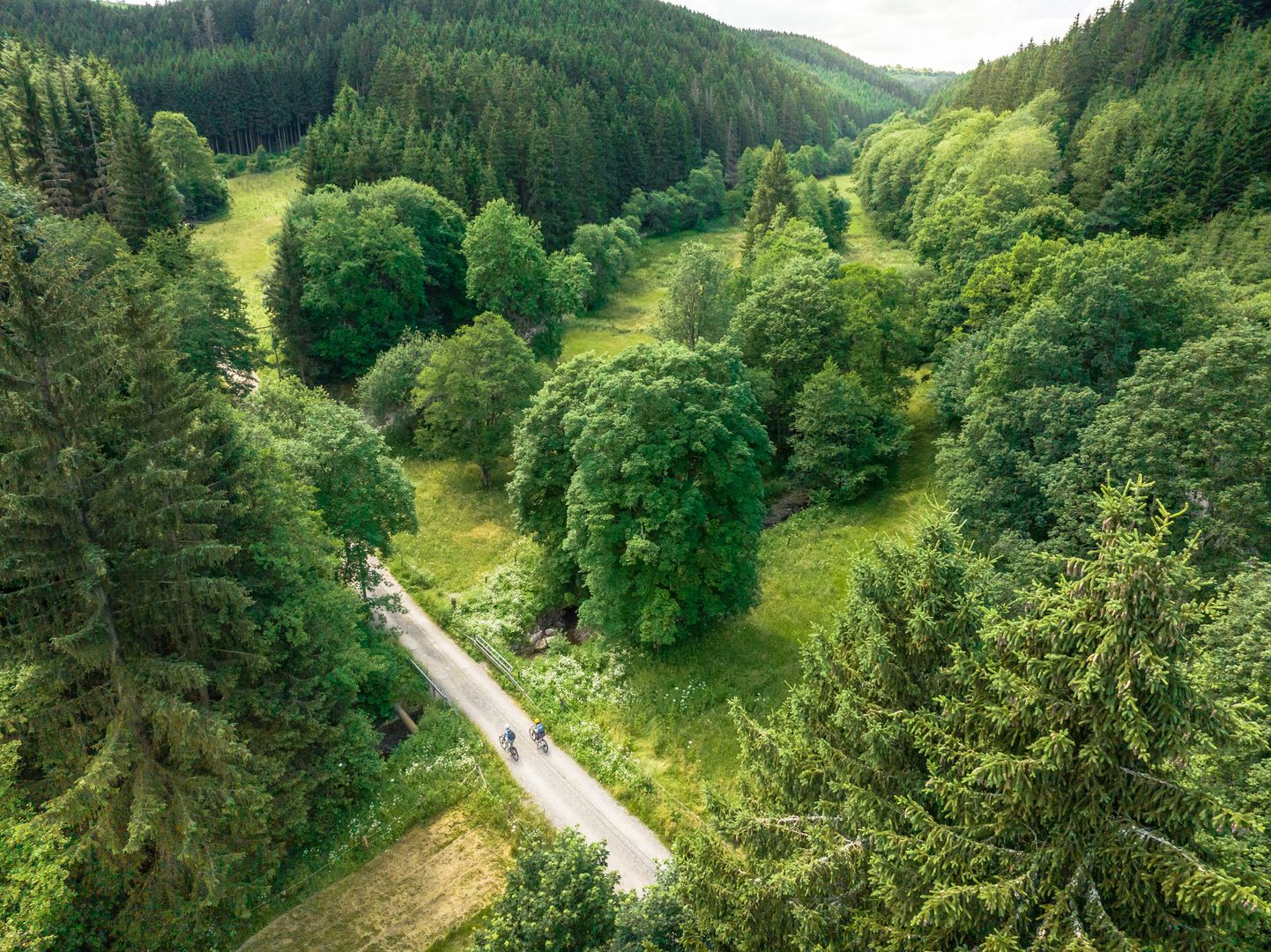 Die EifelRadSchleife beginnt in Hellenthal und wir folgen zunächst dem Verlauf der Olef bis nach Blumenthal. Anschließend begleiten wir den Reifferscheider Bach bis zum gleichnamigen Ort, bevor wir weiter aufsteigen und durch den kleinen Ort Wolfert zur aussichtsreichen Höhe gelangen. Über die Wasserscheide führt uns der Weg durch Waldgebiete und hügelige Landschaften bei Berk und Frauenkron, bis wir schließlich im Kylltal ankommen. Hier folgen wir der Wilsam, einem Quellarm der Kyll, und erreichen bei Udenbreth den höchsten Punkt der Tour, den Gipfel des Rheinlands mit 693 m Höhe. Ein Abstecher zum Aussichtsturm mit dem Eifel-Blick lohnt sich auf jeden Fall. Nach den Anstrengungen der Anstiege belohnt uns die Abfahrt nach Hellenthal entlang des Prether Bachs.