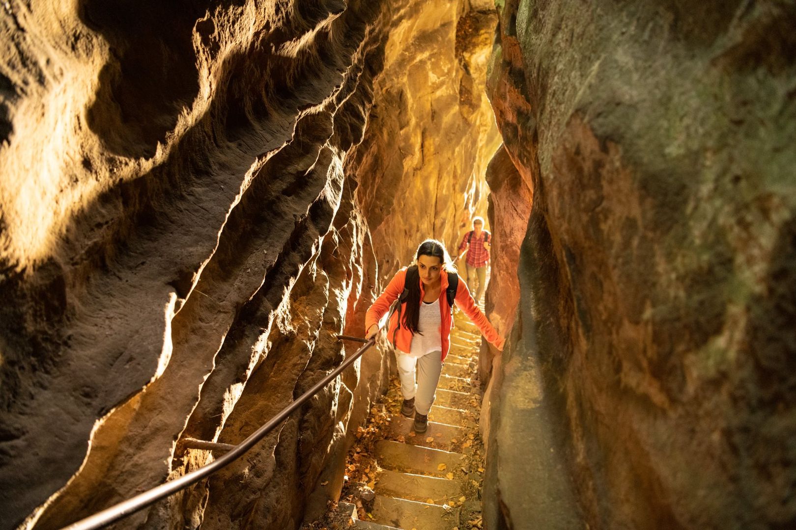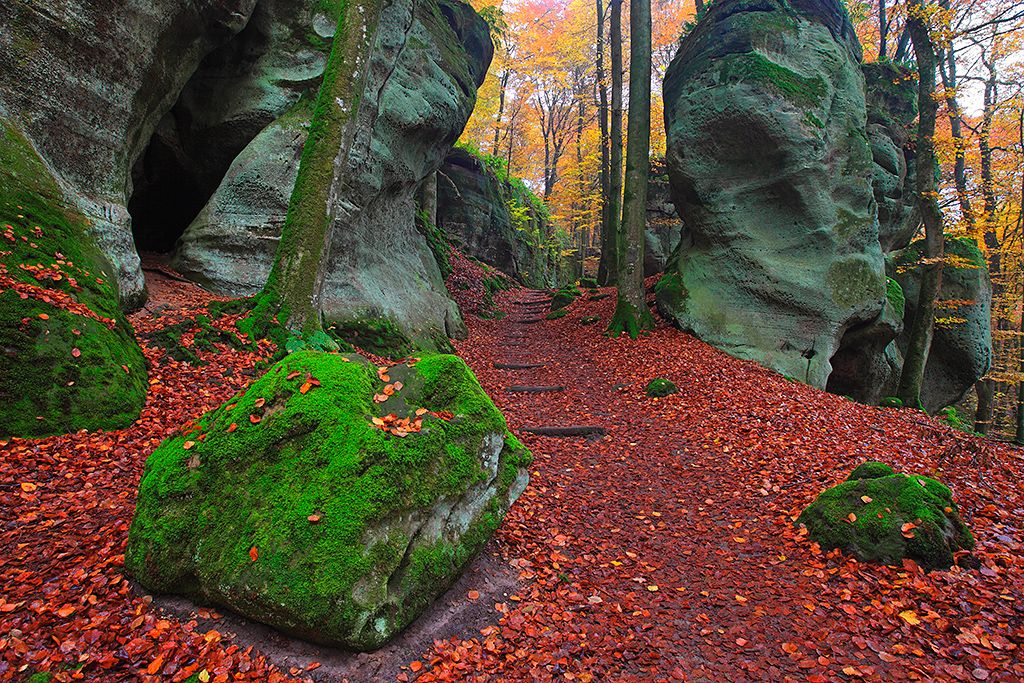 Die Wanderroute Felsenweg 1 im NaturWanderPark delux in der Südeifel startet in der ältesten Stadt Luxemburgs, in Echternach. Weithin schallen die neun Glocken aus den hoch aufragenden Türmen der Basilika, Stolz der ehemaligen Reichsabtei. Unter den strengen Blicken der herrschaftlich herausgeputzten Figuren an der Fassade des Denzelt – einst Versammlungsort, Gericht, Gefängnis und Folterkammer – geht es über den mittelalterlich anmutenden Marktplatz, dann durch eine Gasse mit zahlreichen Cafés bis zum Ortsrand, wo ein Pfad steil bergauf führt.