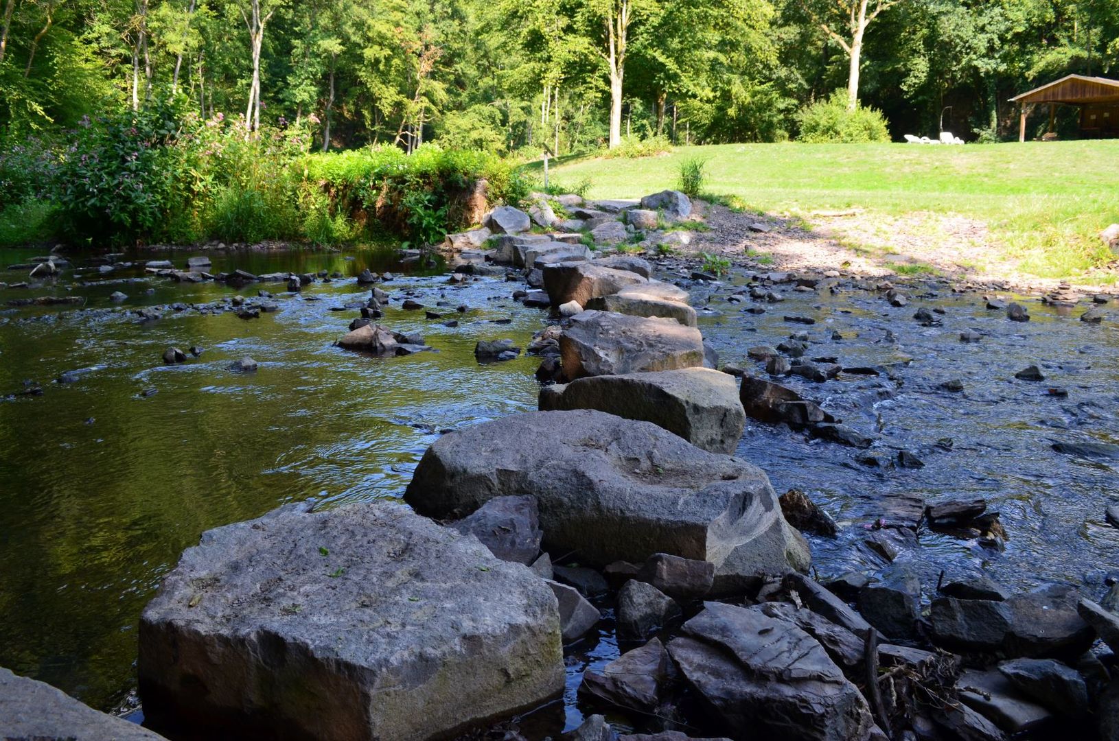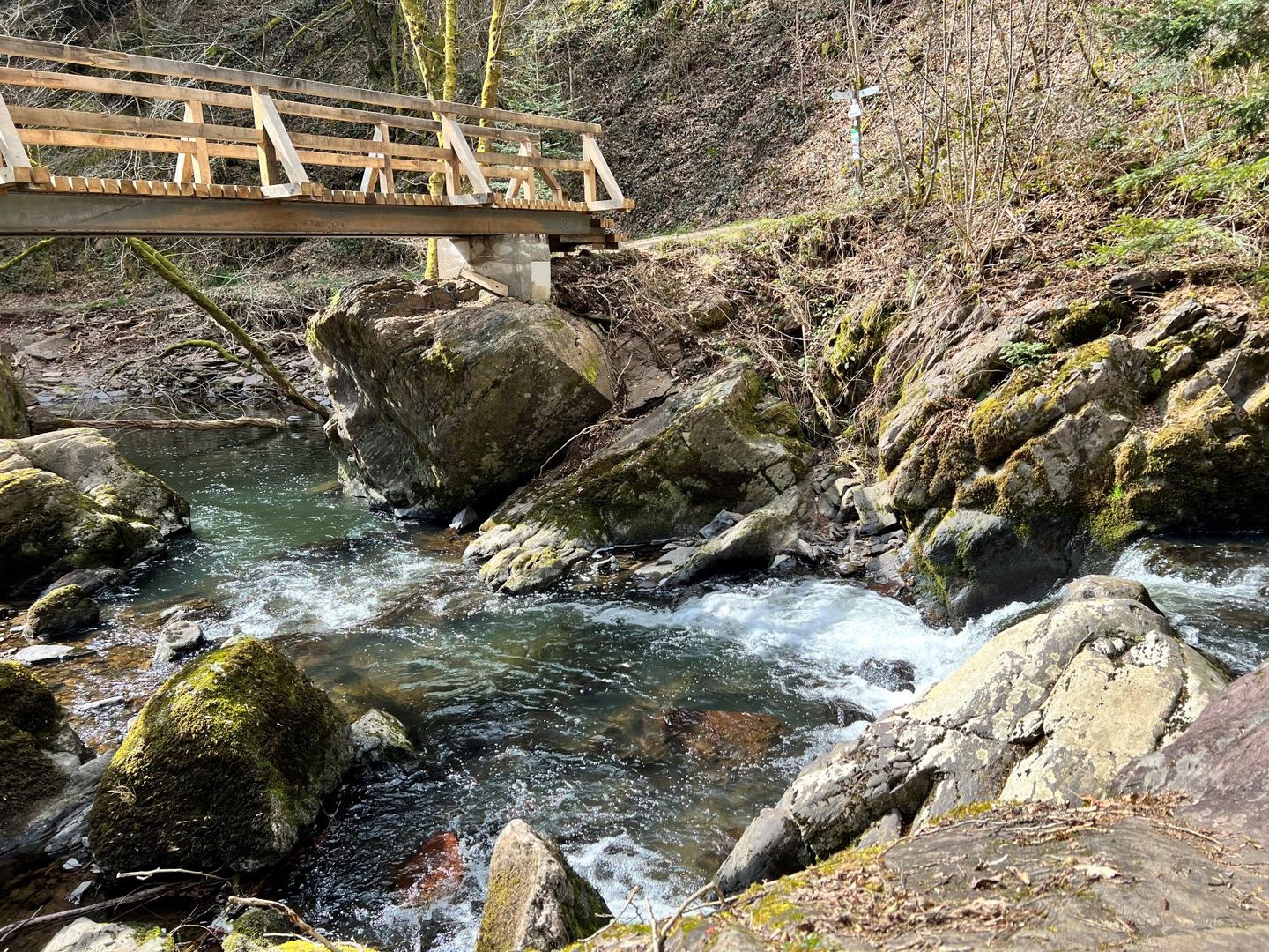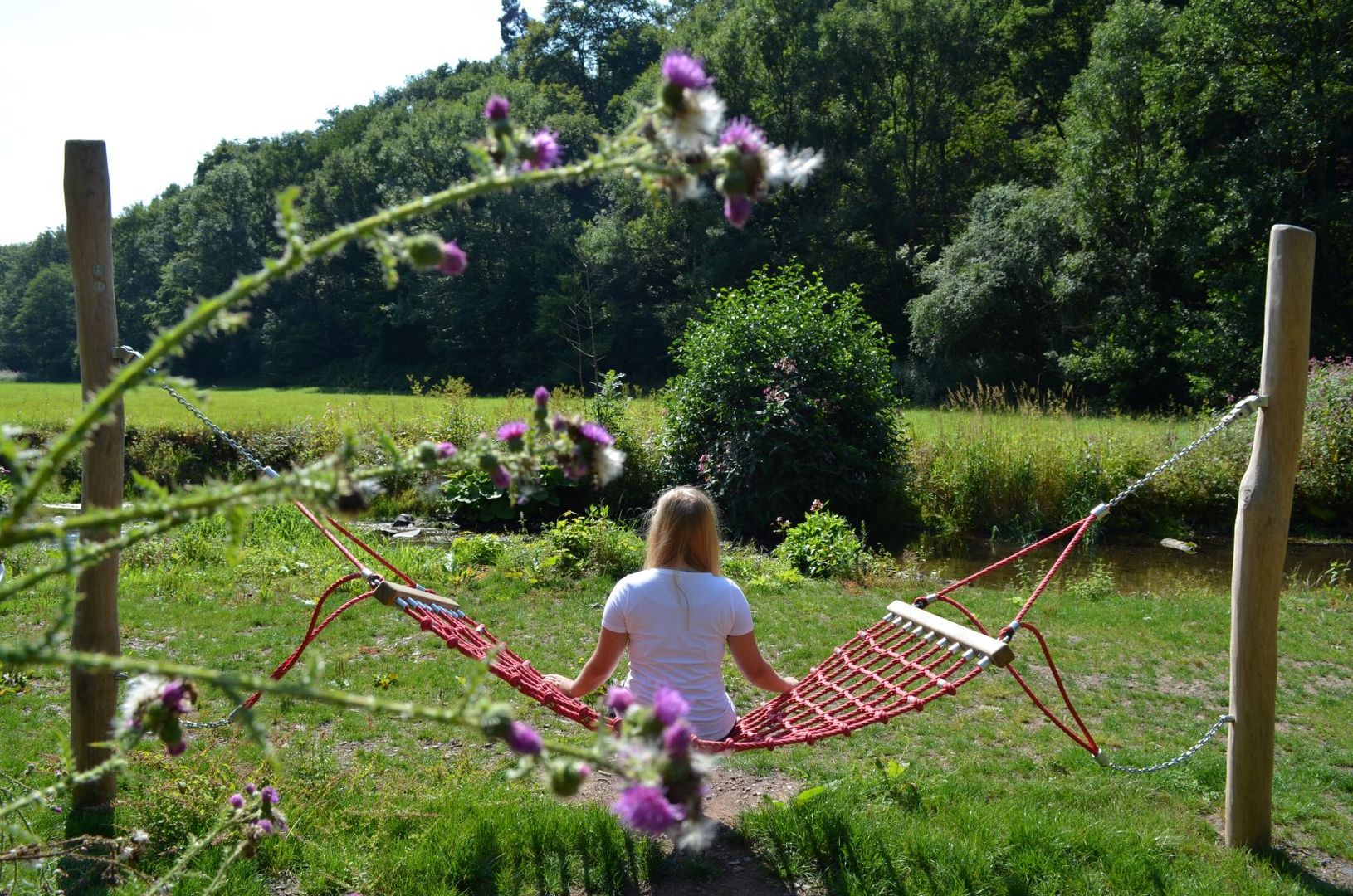 Sieben Stationen befinden sich entlang des Weges, an denen jeweils einer der Sinne angesprochen wird. Auf Steinen sitzen, die Füße im kühlen Nass erfrischen und dem Murmeln des Baches lauschen, ist an einer der Stationen möglich. Genau hinhören heißt es an einer der Klanginstallationen. Wie klingen die Stäbe im Wald? Die Zeit vergessen und sich dem Augenblick hingeben: Dafür sind die Liege oder die Hängematten am Wegesrand bestens geeignet. Die Germanenbrücke zwischen Bettenfeld und Manderscheid steht für die Inspiration. Quirlig bahnt sich das Wasser zwischen den Felssteinen seinen Weg. Die Gedanken frei lassen fällt an diesem Ort leicht.