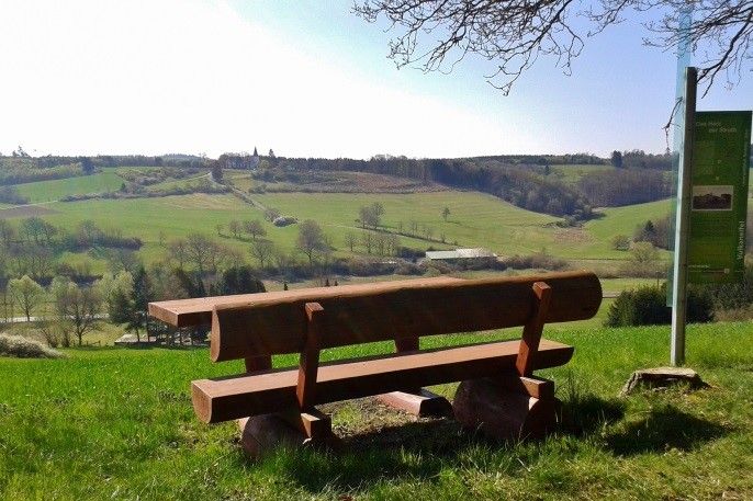 Geheimtipp: Füll' dir etwas köstliches Quellwasser vom Schulldrees in Neichen ab und mach eine Rast auf der im Jahr 2020 erbauten XXL Panoramabank Sarmersbach - der größten Bank in Rheinland-Pfalz.