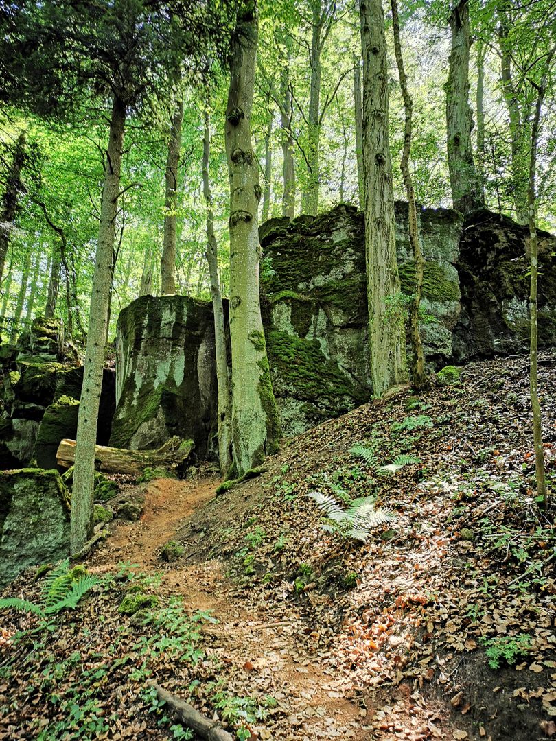 Entlang des Wasser- und Felsenweg zeigt sich die vulkanische Vergangenheit der Region. Die Basaltbrocken der Löhley lassen erahnen, welche Kräfte beim Kampf zwischen Feuer und Wasser aufeinander wirkten. Wild romantisch zeigt sich das Liesertal. Gerade in heißen Monaten lädt die Lieser zu einer kühlen Erfrischung ein. Von hier windet sich der Weg nach oben zum Highlight deiner Wanderung: Die Aarley. Von dem vulkanischen Bergrücken aus erblickst du die Landschaft der Vulkaneifel und das Eifeldorf Üdersdorf. Direkt nebenan zeigt sich eine alte Lavagrube mit herrlichen geologischen Aufschlüssen.