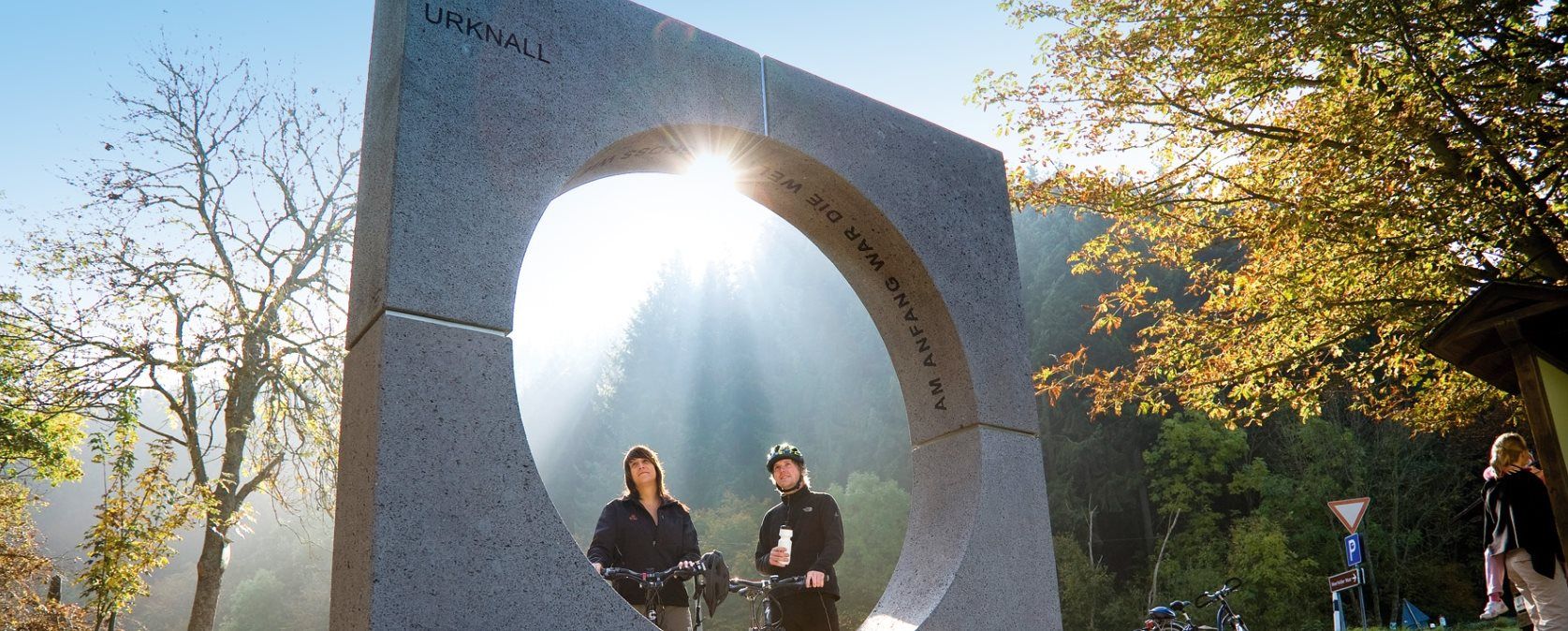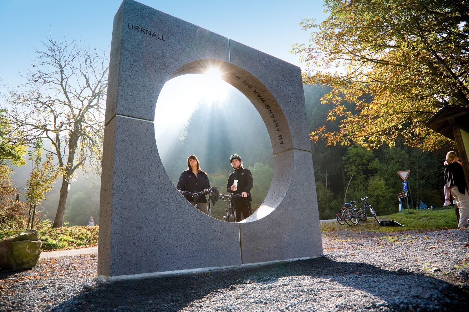 Während einer Fahrradtour auf dem Kosmosradweg Kleine Kyll rücken die unendlichen Weiten des Weltalls auf die Länge einer Tagesetappe zusammen. Hier wird beim Radwandern Eifel alles, was sich unserer Vorstellungskraft von Raum und Zeit entzieht, er"fahrbar“. Jeder zurückgelegte Meter entspricht im kosmischen System 500.000 Kilometern. Auf den ersten Kilometern geht es an den Planeten des Sonnensystems vorbei. Diese sind maßstabsgetreu am Wegesrand platziert. Je nach Entfernung zur Sonne taucht ein Planet auf. Auf dem zweiten Abschnitt radelt man „vom Heute“ zurück in die Vergangenheit und zwar bis zum Urknall.