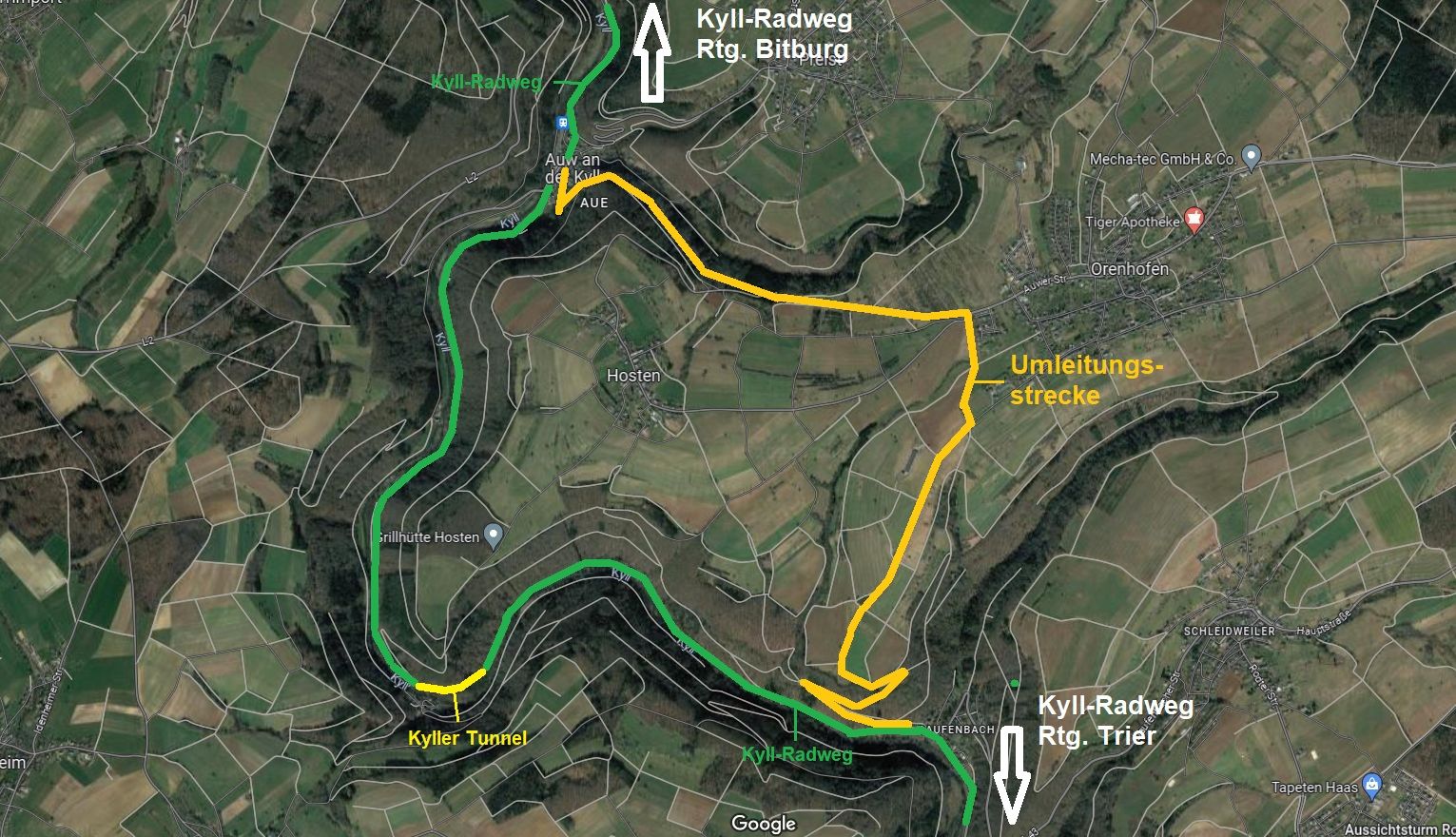 Aufgrund der geplanten Elektrifizierung der Eifelstrecke durch die Deutsche Bahn kommt es im Kylltal streckenweise zu Sperrzeiten des Radweges und zu Ausfällen bei den Zügen.