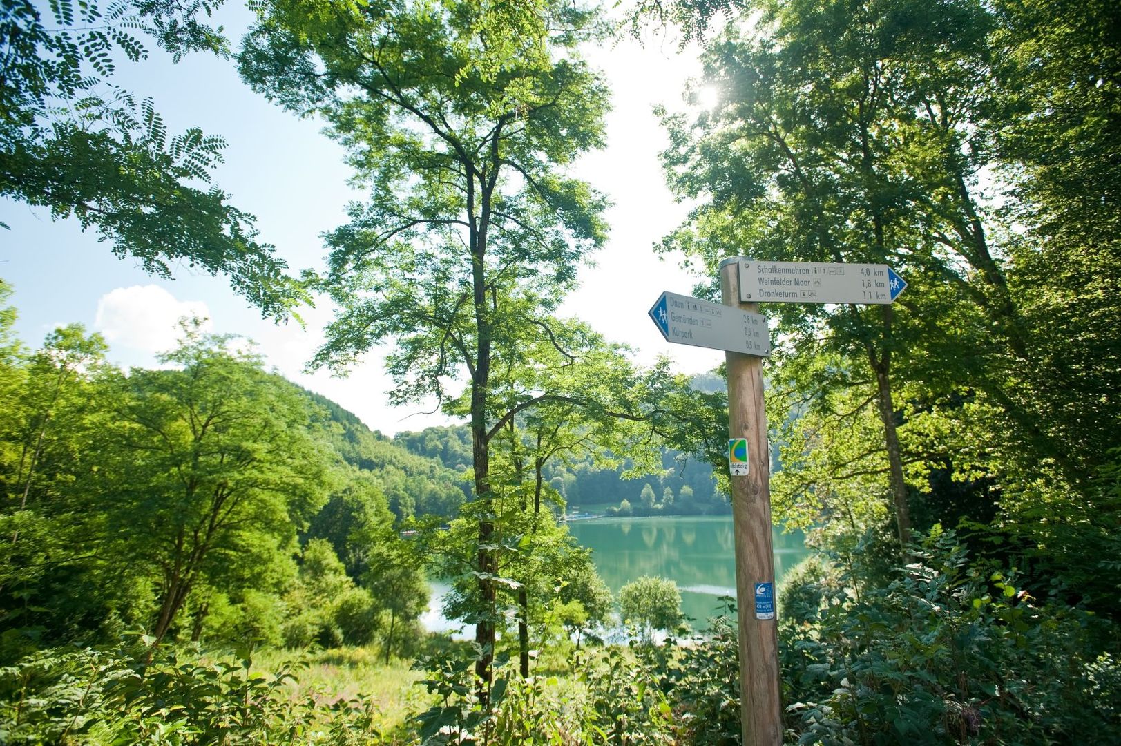 Direkt zu Beginn der Lieserpfad-Etappe 2 wartet eines der Höhepunkte der Wanderung durch die Eifel: Das Gemündener Maar liegt still und beschaulich da, umgeben von hohen Bäumen. Ruhig und einsam geht es weiter, denn dieser Teilabschnitt verläuft im Tal der Lieser durch grünen Wiesengrund und später durch lichte Eichenhaine. Den Abschluss dieser Etappe bildet ein weiterer Höhepunkt: der Felsenpfad oberhalb des Flusses und den Burgen von Manderscheid.