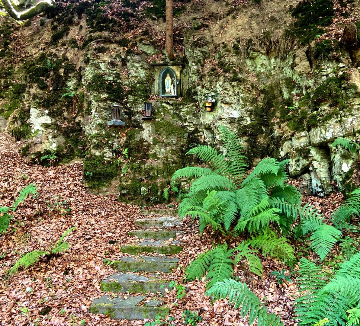 Nach dem Talaufstieg gelangt man zur Station "Hexenverbrennung". An diesem Ort düsterer Geschichte befindet sich nicht nur eine Sitzmöglichkeit, sondern auch der "Lebensturm", in welchem zahlreiche Insektenarten eine Heimat gefunden haben.Entlang der Virneburger Grenze führt der Weg zu einer im Felsgestein dargestellen Muttergottes (Muttergottesgrotte "Im Kesselchen"). Von dort geht es zunächst zum Römischen Steinbruch und weiter zu den Römischen Hügelgräbern, bevor man zum Mahnkreuz "Auf de Worth" aufsteigt, dem höchsten Punkt des Weges. Hinab gelangt man über den Tannenweg wieder zurück zum Ausgangspunkt an der Realschule Plus in der Ortsmitte.