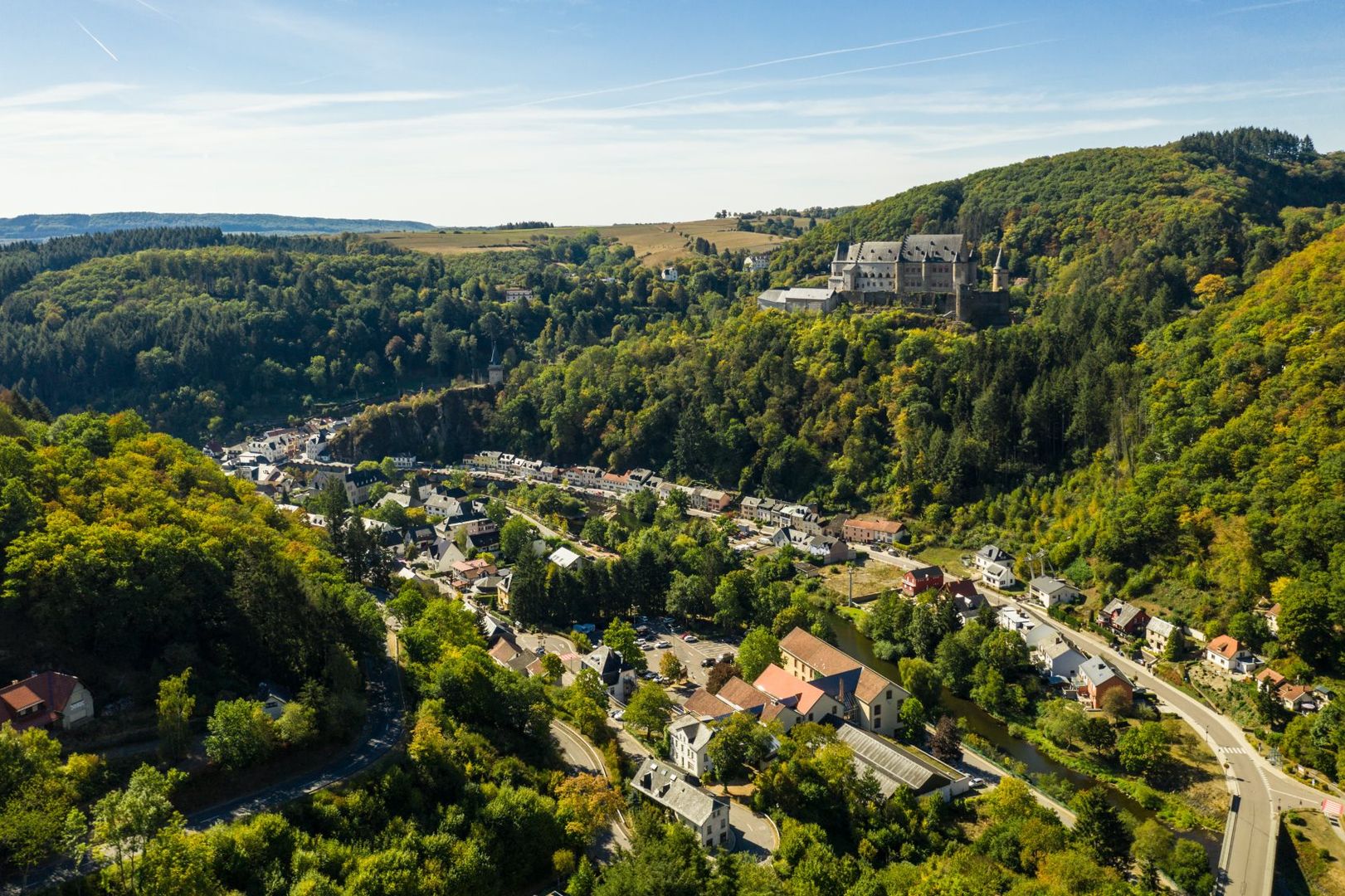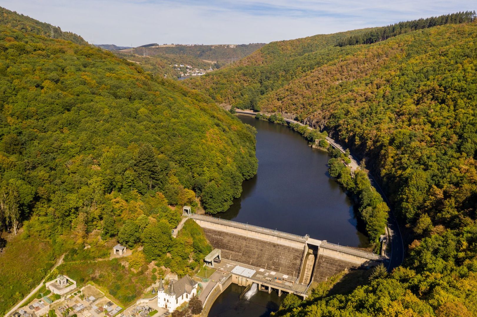 Die Nat‘Our-Route 5 startet im mittelalterlichen Vianden, etwas südlich der sehenswerten St. Rochus Kirche, die deutlich von der Staumauer überragt wird. Ihr wendet euch bergaufwärts in Richtung des wiederaufgebauten Schlosses von Vianden, eine der bedeutsamsten und mächtigsten Burgen Europas. Das Schloss ist allemal einen mehrstündigen Besuch wert. Jetzt lasst ihr es links liegen, gewinnt über Serpentinen rasch an Höhe und erreicht die Bergstation des Viandener Sessellifts. Von hier geht es nun etwas gemütlicher durch lichten Mischwald zur Bildchenkapelle, von der aus ihr eine herrliche Aussicht über die aufgestaute Our und ihr Tal habt. Bergab umrundet ihr die aus dem Berg ragende Turbine 10 und erreicht die „Ourdall-Promenade“, der ihr bis zur blauen Brücke hinter Bivels folgt. Hinter der Brücke seid ihr nun auf deutschem Boden. Bergan führt ein Waldweg zum Felssporn, auf dem die Ruine Falkenstein thront. Die Burg kann nicht betreten werden, allerdings bietet ein kleiner Pavillon vor dem trutzigen Eingangsportal bezaubernde Dornröschen-Romantik mit Burgblick.