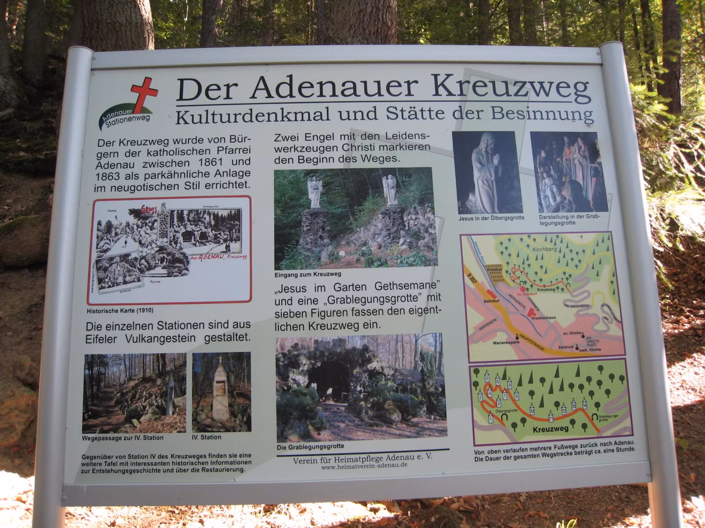 Von hier aus geht’s über den historischen Marktplatz, durch die Kollengasse, zum inzwischen über 150 Jahre alten Kreuzweg. Vorbei an den 14 Stationen, hinauf zur Grablegungsgrotte. Kurz hinter der Grotte geht es links hoch über einen kurzen Anstieg auf einen höher gelegenen Weg, der rechts herum in einem Bogen um die Winsendell zum Schwallenberg führt. Dort hat man einen ersten schönen Blick über Adenau und Wimbach bis nach Kottenborn. Von hier ist es nur noch ein kurzer leichter Weg über den Schwallenberg hinunter zum Wanderparkplatz Näsbach. Weiter die Näsbachstraße hinunter bis zum Restaurant „Gemütliche Ecke“. Dort wird die Bundesstraße überquert und am Adenauer Bach vorbei geht’s bis zum „Aldi“, wo man wieder die B 257 erreicht und nach ein paar Metern in Breidscheid an der Nürburgring-Nordschleife ankommt. An der Rennstrecke entlang aufwärts zum Wehrseifen, einem bekannten Zuschauerplatz an der Nordschleife. Weiter zum kleinen Wehrseifentunnel wodurch man die Rennstrecke unterquert. Hier eröffnet sich eine tolle Aussicht über Adenau bis nach Reifferscheid. Dann geht´s hinunter zum Eckernbaum, über die Kallenbachstraße hoch, am Schulzentrum vorbei und wieder abwärts über einen kurzen Waldweg zum Weg über dem ehemaligen Schwimmbad. Zwischen Tennisplatz und Eifelstadion hindurch führt der Weg in Richtung Wimbach. In Höhe des BSC Schießstandes biegt man rechts ab, überquert die Wimbachstraße, um vor dem Elektrizitätswerk links steil in den Wald aufzusteigen. Nach kurzem Anstieg geht es in einem Bogen wieder in Richtung Adenau. Über einen schönen, gemächlich ansteigenden Waldweg, der nach kurzer Zeit in einem offenen Wiesengelände mündet, erreicht man den alten Sportplatz auf dem Hirzenstein, der inzwischen als Reitplatz genutzt wird. Von hier oben hat man wieder eine tolle Aussicht über Adenau bis hin zur Hohen Acht. Vorbei am neuen Baugebiet des Oberen Hirzensteins geht es jetzt die Wimbachstraße hinunter ins Zentrum von Adenau, bzw. zum Ausgangspunkt Parkplatz.