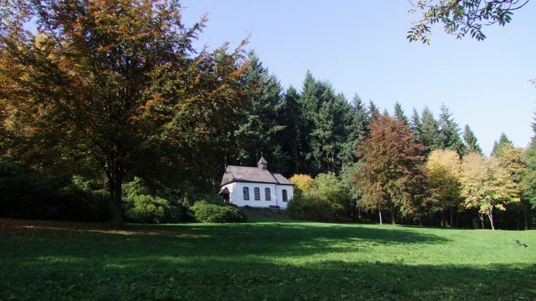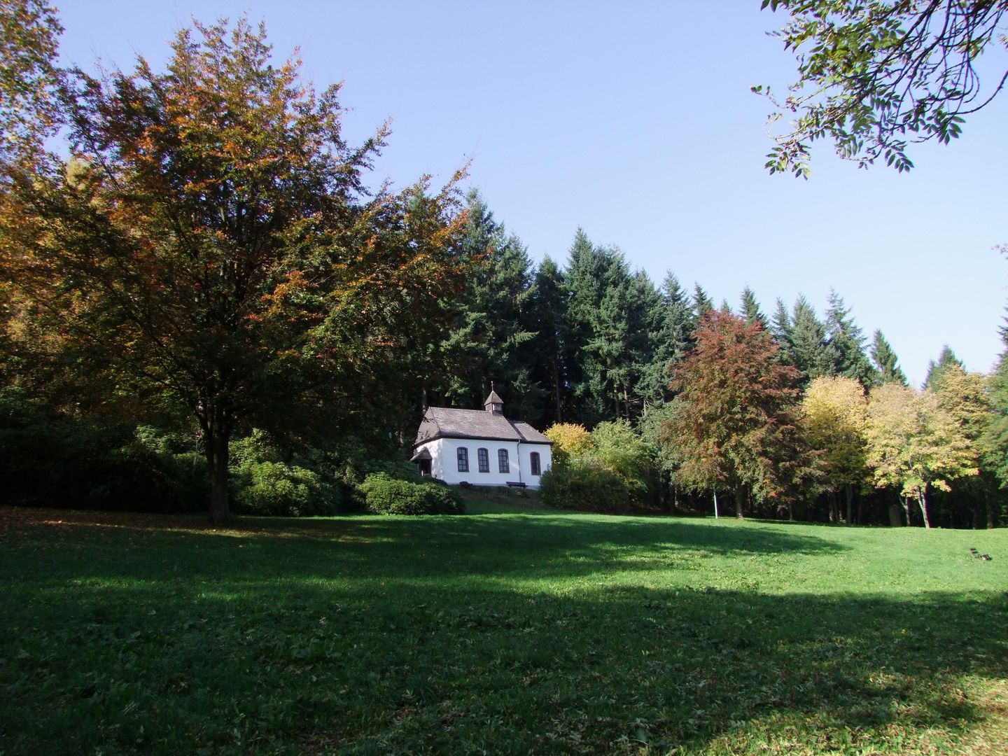 Der Weg führt vorbei am Kalvarienberg, der 1949 durch die Explosion dort gelagerter Munition quasi in Stücke gerissen wurde, so dass vier Jahre nach dem Ende des 2. Weltkriegs erneut Tod und Zerstörung in Prüm regierten. Noch heute beherrscht ein riesiger Krater den Gipfel, und ein Mahnmal erinnert an das schreckliche Ereignis. Für uns als Wanderer bietet der Berg jedoch auch wunderbare Ausblicke auf Prüm. Ein Abstecher zu der hübschen, nach der Katastrophe neu errichteten Kalvarienbergkapelle mit Blick über Prüm und über den Kreuzweg sei jedem wärmstens ans Herz gelegt. Vom Panoramaweg selbst kann der Blick hier oben nach Niederprüm und über das Mehlenbachtal mit seiner Wacholderheide schweifen und weit darüber hinaus bis nach Belgien.