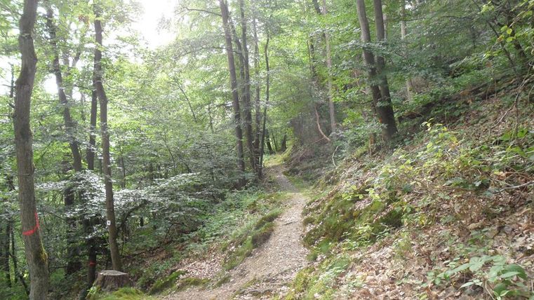Nach ausgiebiger Rast setzen wir unsere Wanderung fort. Wir nehmen den Waldsteig unterhalb des Türmchens und steigen auf ihm durch den Wald talwärts.