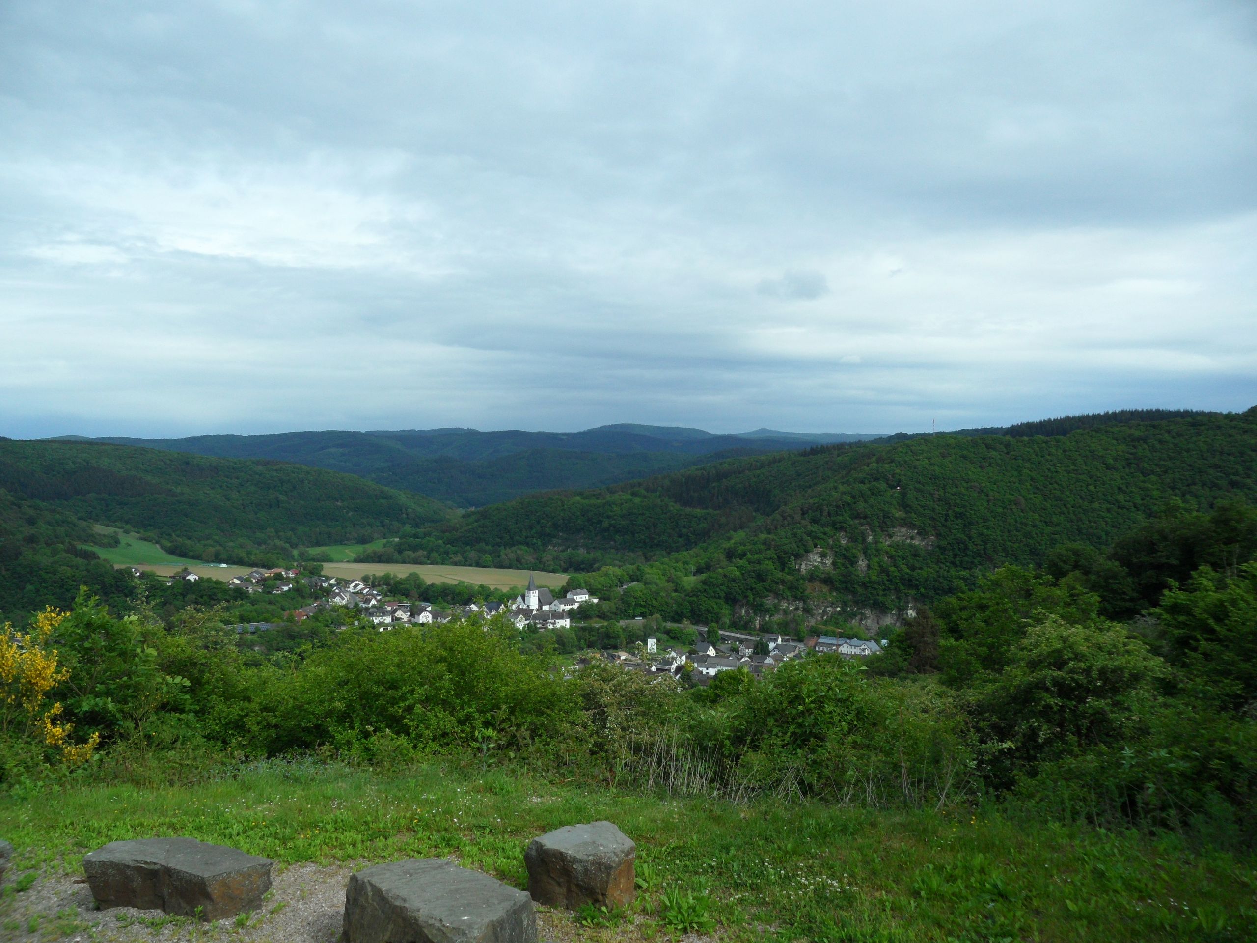 Bevor uns der Wald verschlingt, lohnt sich eine kurze Verschnaufpause mit dem herrlichen Blick auf den Ort Insul und das Ahrtal. Weiter geht’s, dem Weg folgend, immer weiter bergauf.