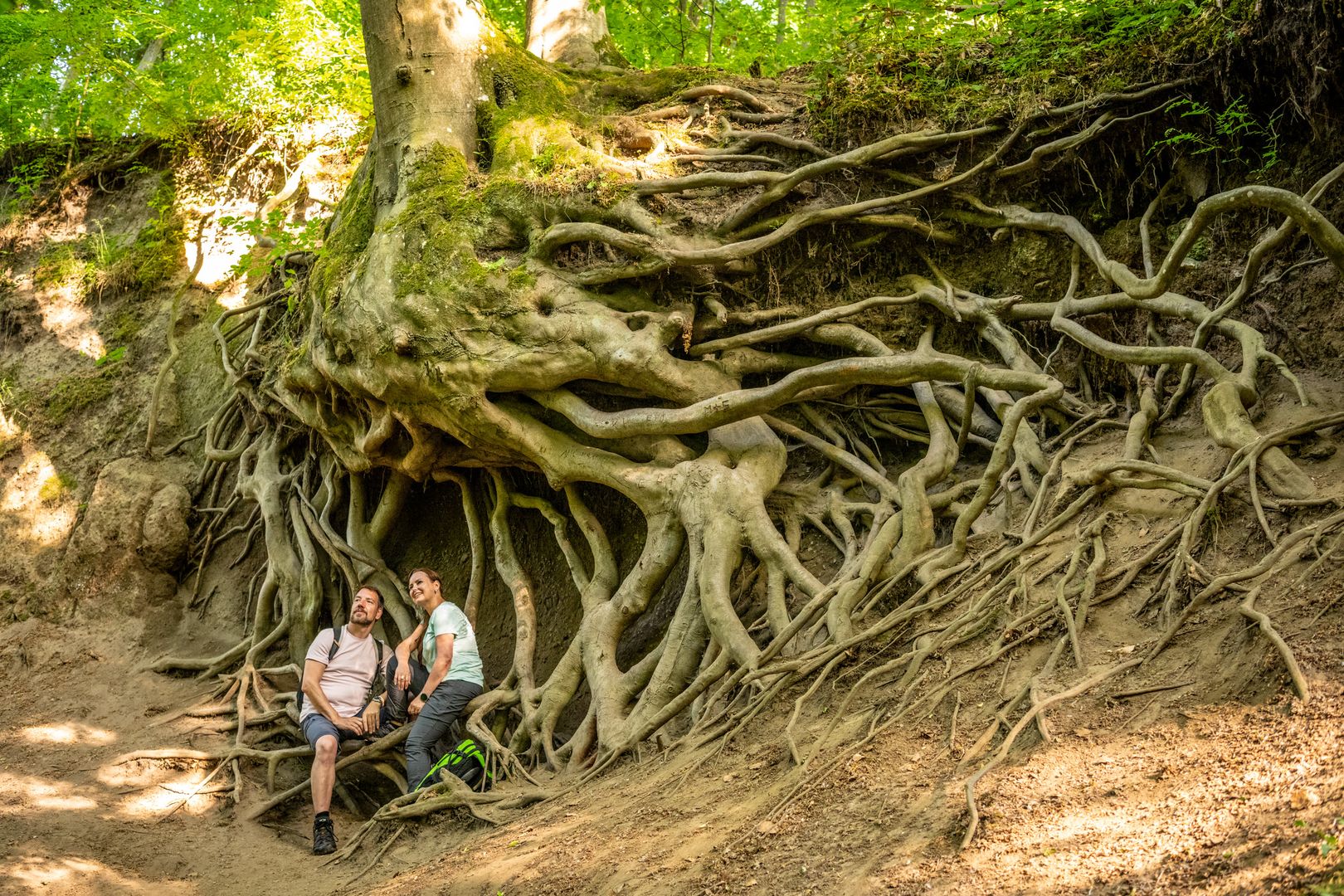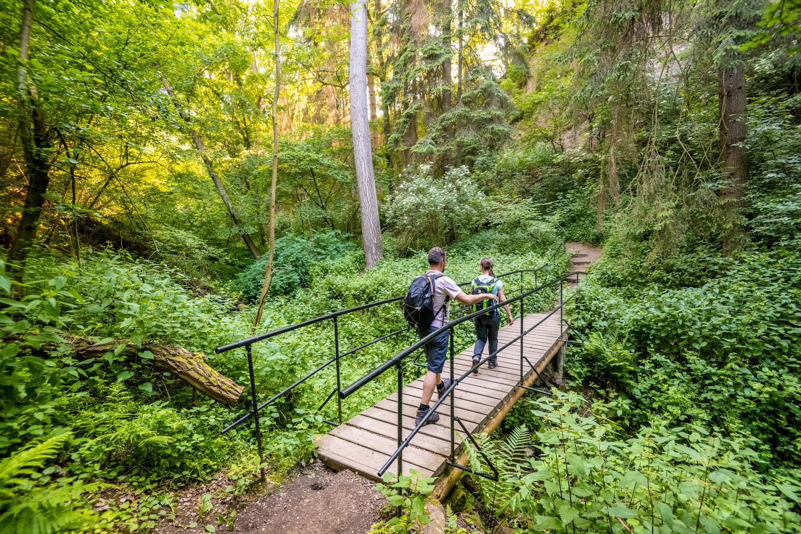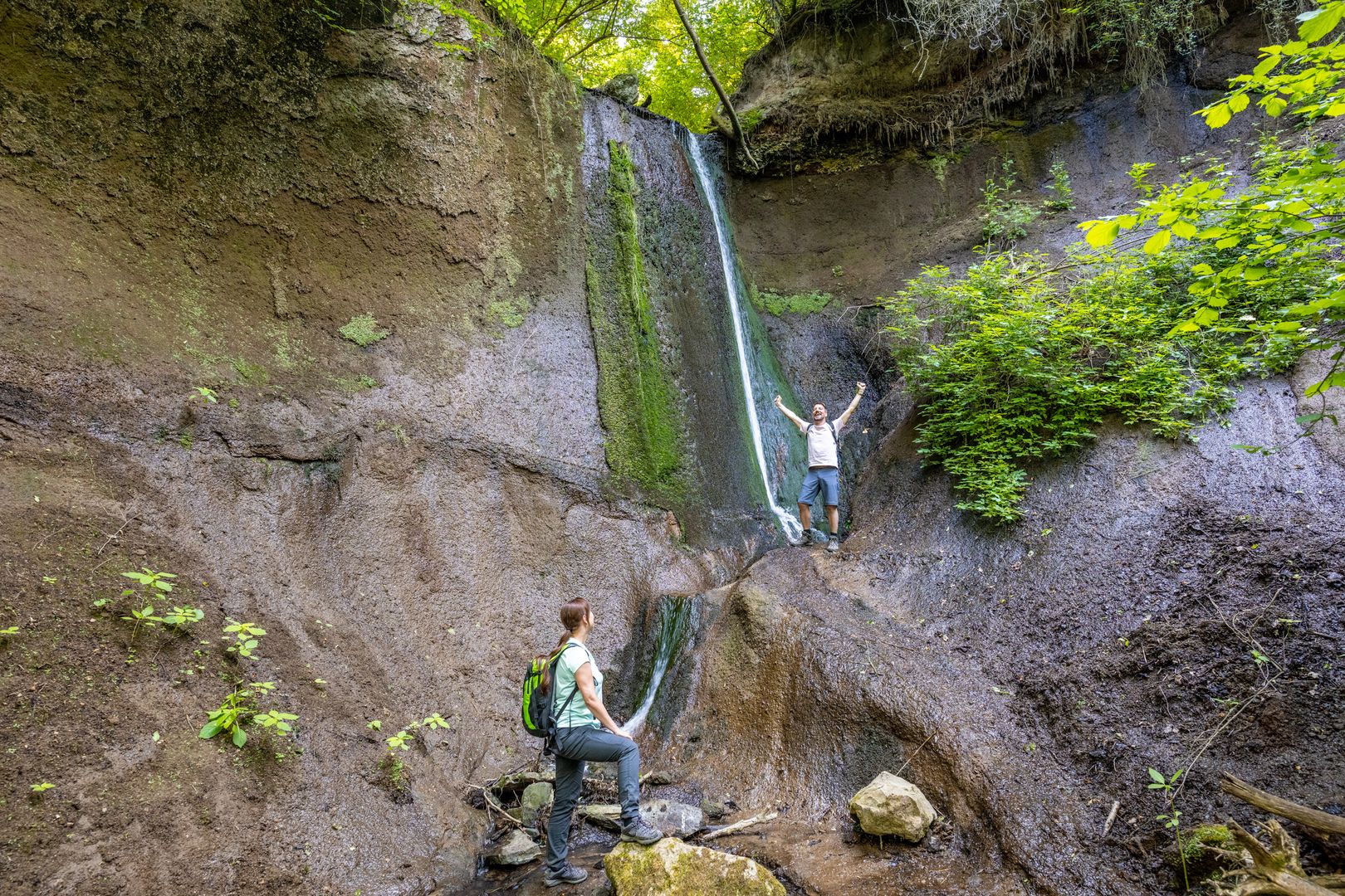 Dann geht es in die Wolfsschlucht. Wie ein kleiner Urwald erscheinen hier die bewachsenen Felsen, im Bachbett erkennt man sprudelnde Quellen und sogar ein Wasserfall wird geboten. Ein Stück weiter kommt man zur Römerquelle aus der CO2 -haltiges Wasser mit leichtem Schwefelgeruch sprudelt.