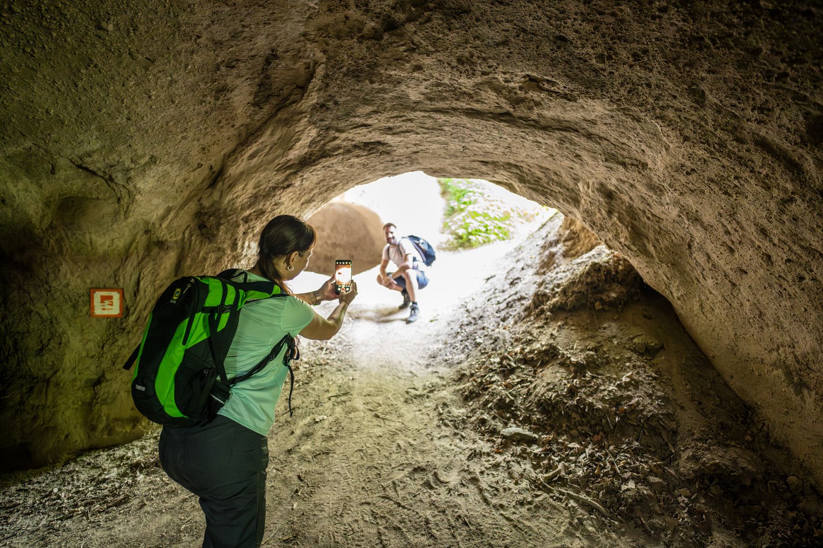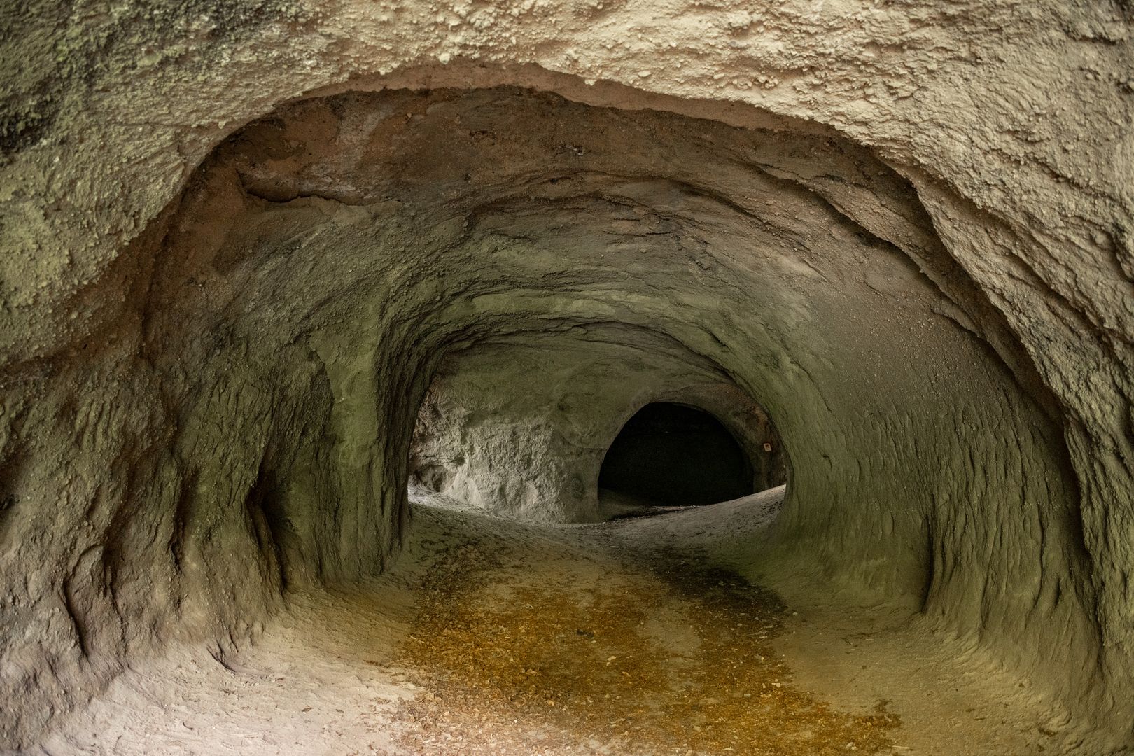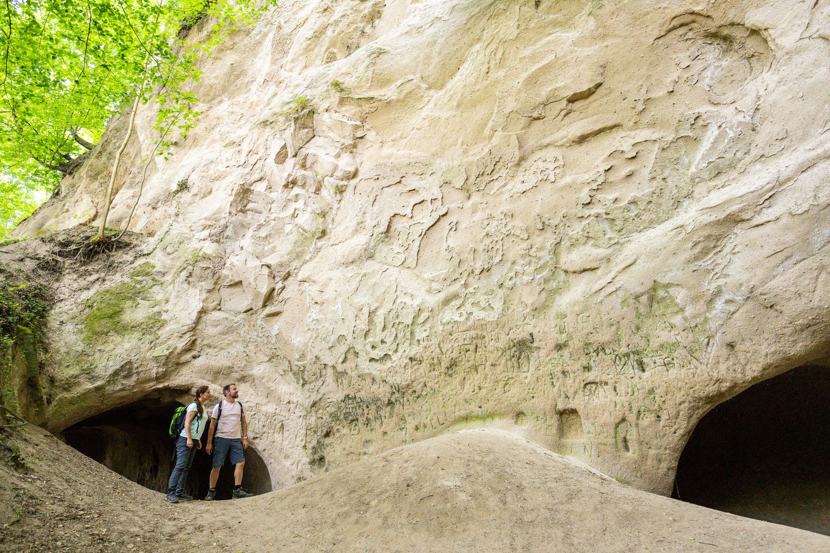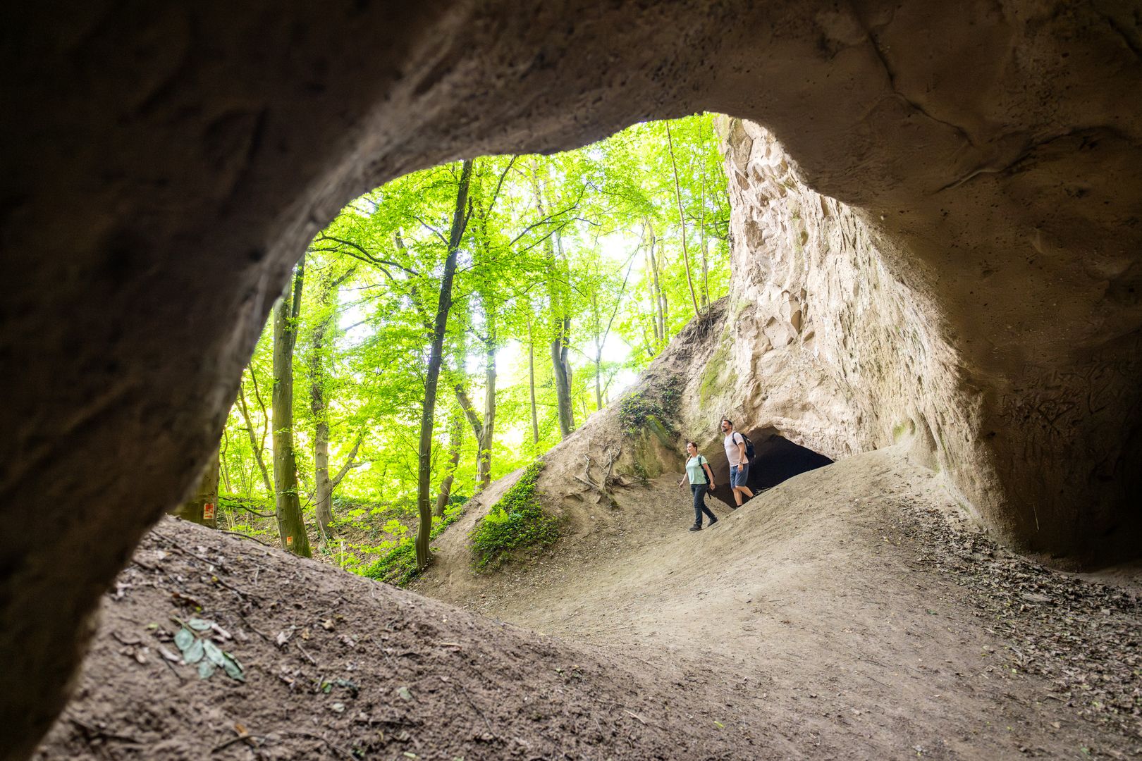 Der Weg unterquert ein Viadukt und führt schließlich durch die großen begehbaren Trasshöhlen. Der Trass ist beim Ausbruch des Laacher See Vulkans vor ca. 13.000 Jahren entstanden und wurde für den Hausbau abgebaut. Zurück geblieben sind die Höhlen.