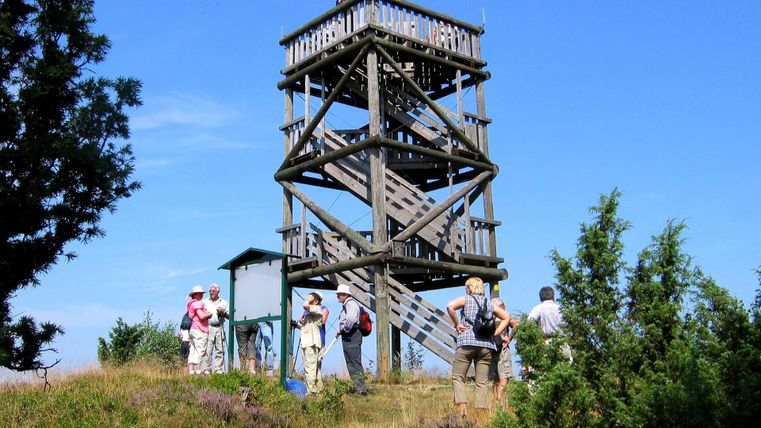 Über die anschließenden Waldwege wird das Waldgut Schirmau erreicht. Der Weg führt links hinter dem Waldgut zum Aussichtsturm „Weiselstein“. Am Aussichtsturm Weiselstein blüht im Spätsommer ein kleines Sück Heide, umgeben von Wacholder. Weiter geht es durch die Felder und Wiesen bis zum Ort Schalkenbach. Auf dem Weg zurück nach Königsfeld treffen Sie auf weitere Skulpturen und alte Wegkreuze. An der L83 überqueren Sie Vinxtbach und Straße. Nach rechts über den Gehweg der L83 kommen Sie linkerhand ansteigend durch das Königsfelder Neubaugebiet und zum Ausgangspunkt zurück.