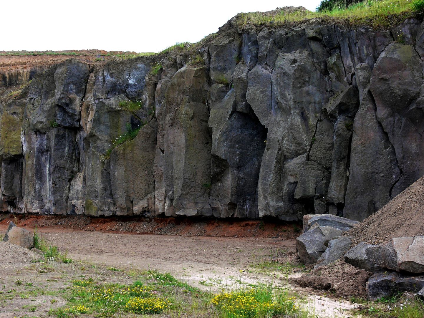 Das Wanderweglogo zeigt ein rotes Schwert, ein blaues Gefäß und ein grünes Rad. Darunter der Schriftzug "Zähbasaltweg".