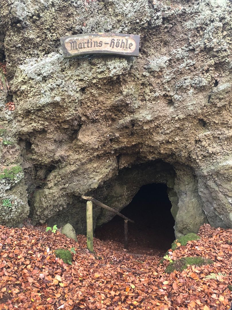 Ausgangspunkt der Rundwanderung ist das Gemeindehaus in Hohenfels-Essingen. Wir folgen der Markierung und den Hinweisschildern zur Grotte, wobei uns der Weg immer weiter bergauf führt, vorbei an alten Kreuzen bis schließlich zur Grillhütte. Von hier erkundigt man die Höhlen und wendet sich nach der Mariengrotte nach links, einen kleinen Pfad bergab folgend. Unterwegs findet man noch alte Mühlsteine im Wald liegend. Auf dem breiten Waldweg angekommen, wandern wir rechts weiter, vorbei am Steinbruch Schlick, bis wir schließlich den Wald verlassen. Nun geht es rechts aufwärts auf den Gonnenstal. Von der Höhe haben wir wunderbare Ausblicke auf die schöne Eifellandschaft. Hier halten wir uns links und biegen nach einiger Zeit links auf einen Feldweg ab, der vor dem Wäldchen nach rechts abbiegt, um anschließend nach links abzubiegen. Wir folgen den Serpetinen abwärts und verlassen den Wald. Wir halten uns links, gehen am Friedhof und Weihern vorbei und folgen dem Teerweg
