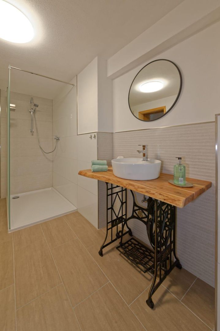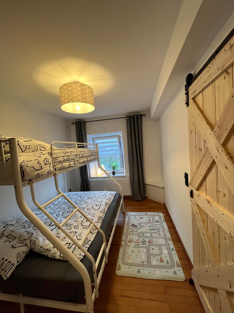 Badezimmer mit ebenerdiger Dusche und Badewanne. Ein Schlafzimmer mit Doppelbett und ein Schlafzimmer mit einem Hochbett (Liegefläche unten 140cm, oben 90cm).
