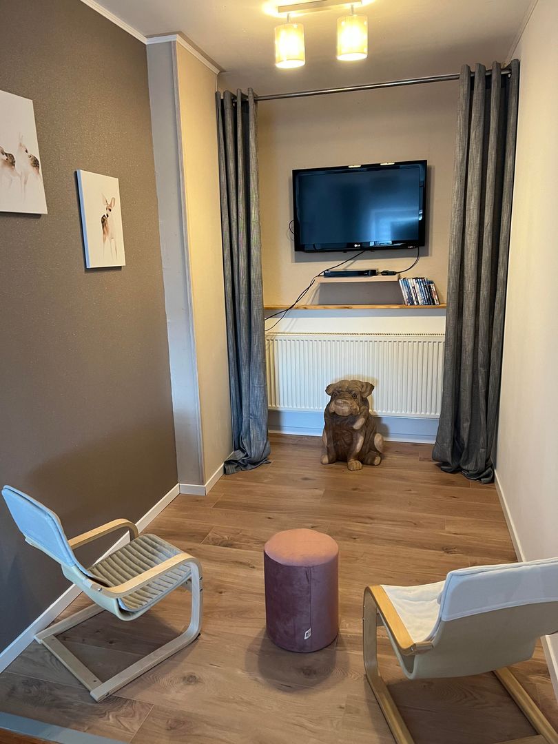 Es erwartet Sie eine voll ausgestattete Küche (Backofen, Ceranfeld, Geschirrspüler, Padmaschine und Kühl- Gefrierkombination) mit Essbereich. Von hier aus gelangen Sie zum Aussenbereich mit überdachter Terrasse, Gasgrill und gemütlichem Sitzbereich. Wohnzimmer mit Flachbildschirm.