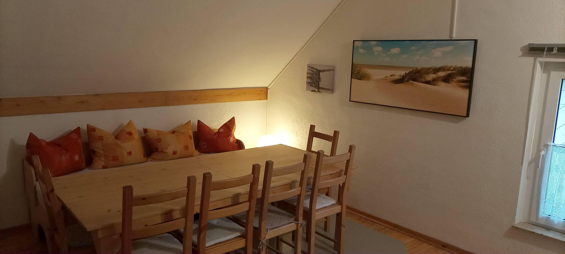• Ein gemütlicher Essbereich mit einem großen Holztisch und Stühlen. An der Wand hängt ein Bild von einer Dünenlandschaft.