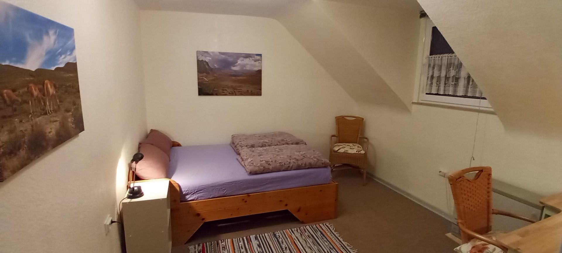 • Ein gemütliches Zimmer mit einem Bett und einem kleinen Tisch. An den Wänden hängen Bilder, und ein Stuhl ist neben dem Bett platziert.