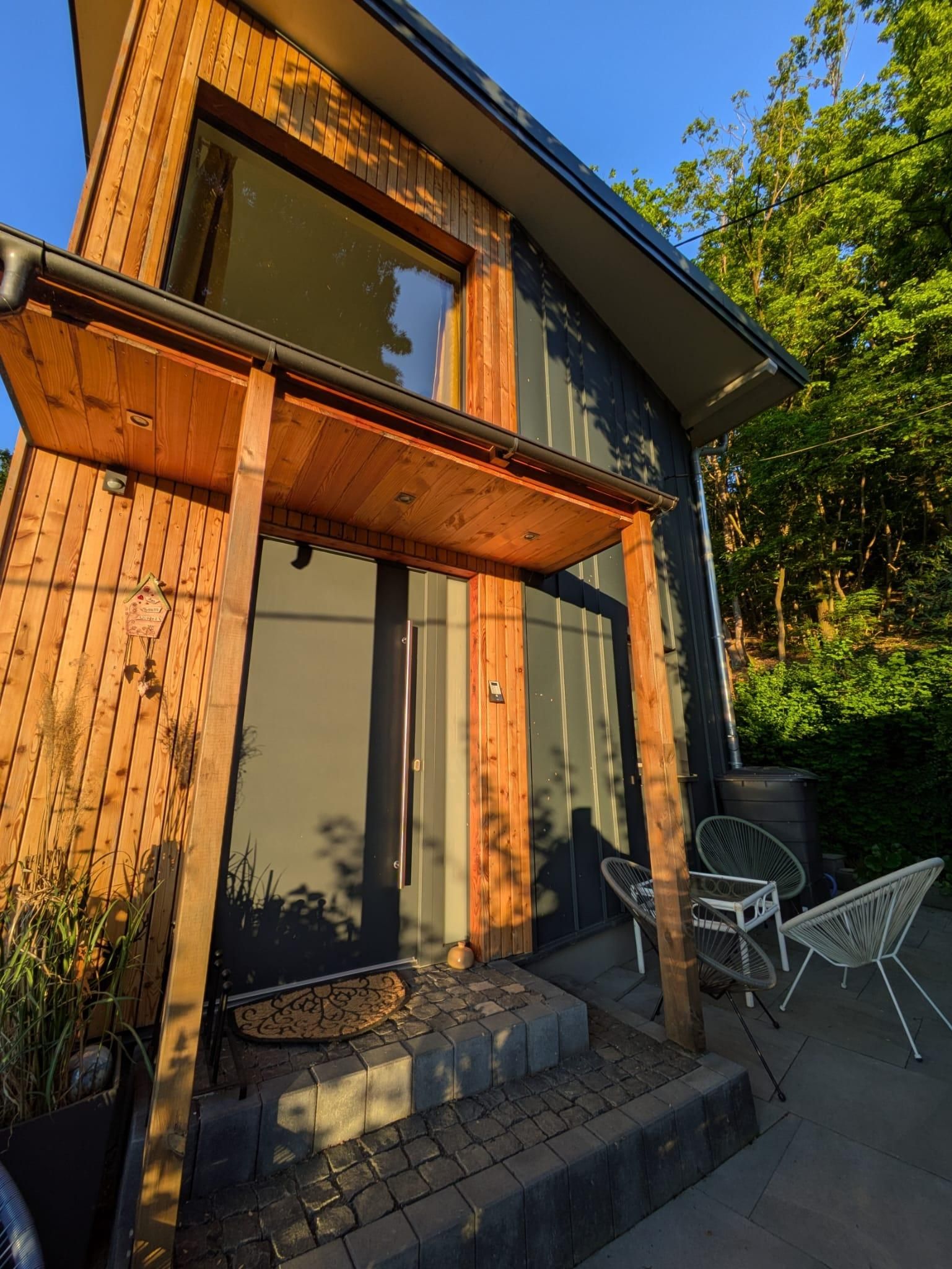 Hier empfängt Sie eine große Terrasse mit Bestuhlung und der überdachte Hauseingang. Hinter dem Haus befindet sich eine weitere Terrasse mit Garten.