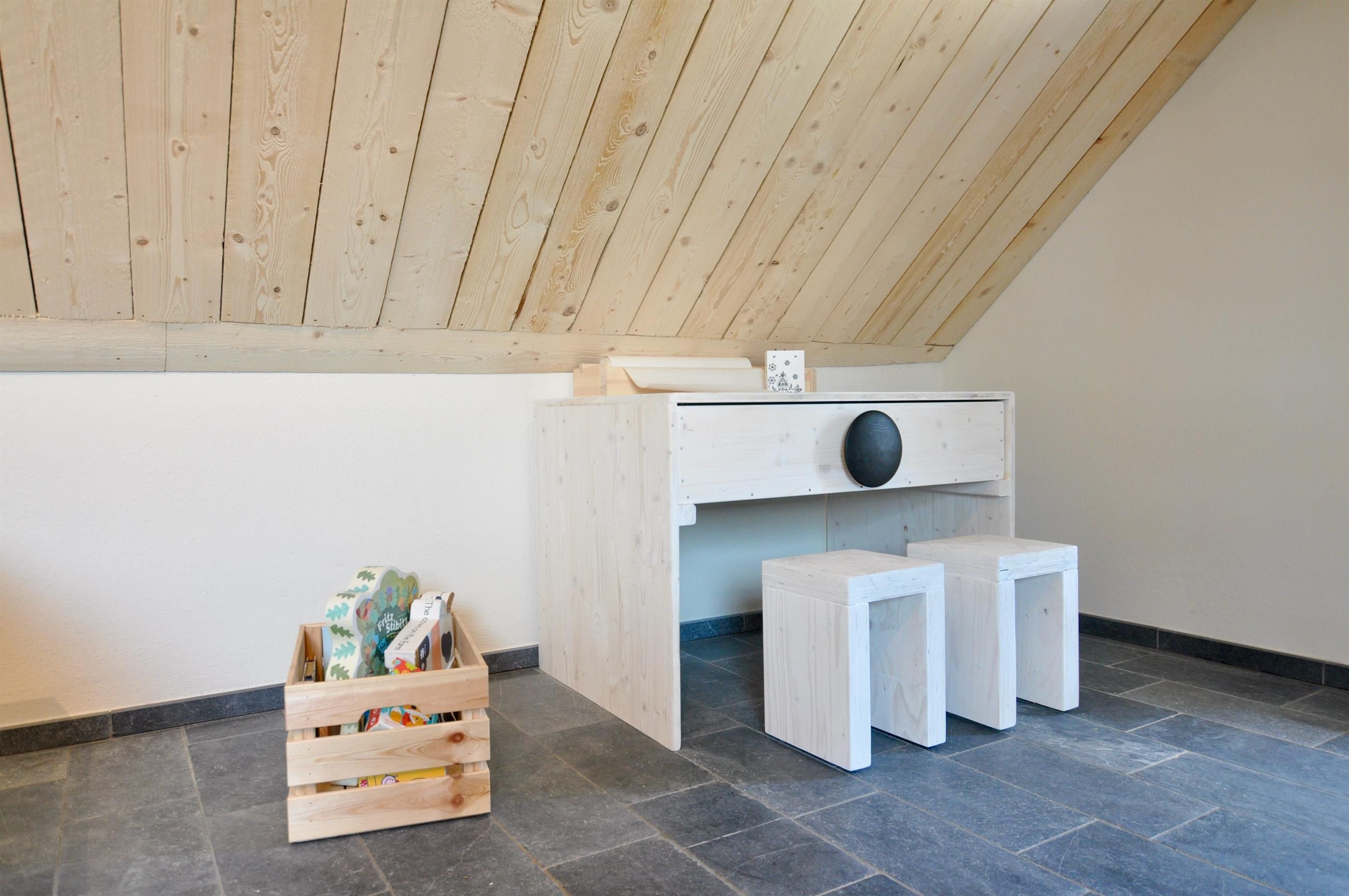 Das Häuschen ist im Inneren durchdacht und mit Liebe zum Detail eingerichtet. Das Wohnzimmer im Anbau ist großzügig und geht direkt auf die Holzterrasse, die u.a. mit Hochbeetblumenkästen, einem Gasgrill und zwei komfortablen Liegen und Sonnenschirm ausgestattet ist. Die Küche ist modern und mit allem ausgerüstet, was man so braucht; auch Bad und WC sind ganz neu gemacht. Im 1.Stock befindet sich eine bodentiefe Dusche! Das Schlafzimmer im 1. Stock hat ein kleines Seitenräumchen, das als Garderobe oder auch als Babyzimmer genutzt werden kann - überhaupt ist das Haus ganz darauf ausgerichtet, auch Kinder aufzunehmen, vom bereitstehenden Hochstuhl über den Toilettensitzverkleinerer bis hin zu Kinderspielen und -büchern. Das Kinderzimmer im 1. Stock ist auch dementsprechend eingerichtet. Der Raum im offenen großen Dachgeschoss (nicht abschließbar) - mit einer super freistehenden Badewanne mitten im Raum, einem weiteren Fernseher, Turngeräten usw. und einem sehr großen Doppelbett kann entweder als weiteres Schlafzimmer oder als Familienzimmer zum Entspannen oder Spielen genutzt werden.