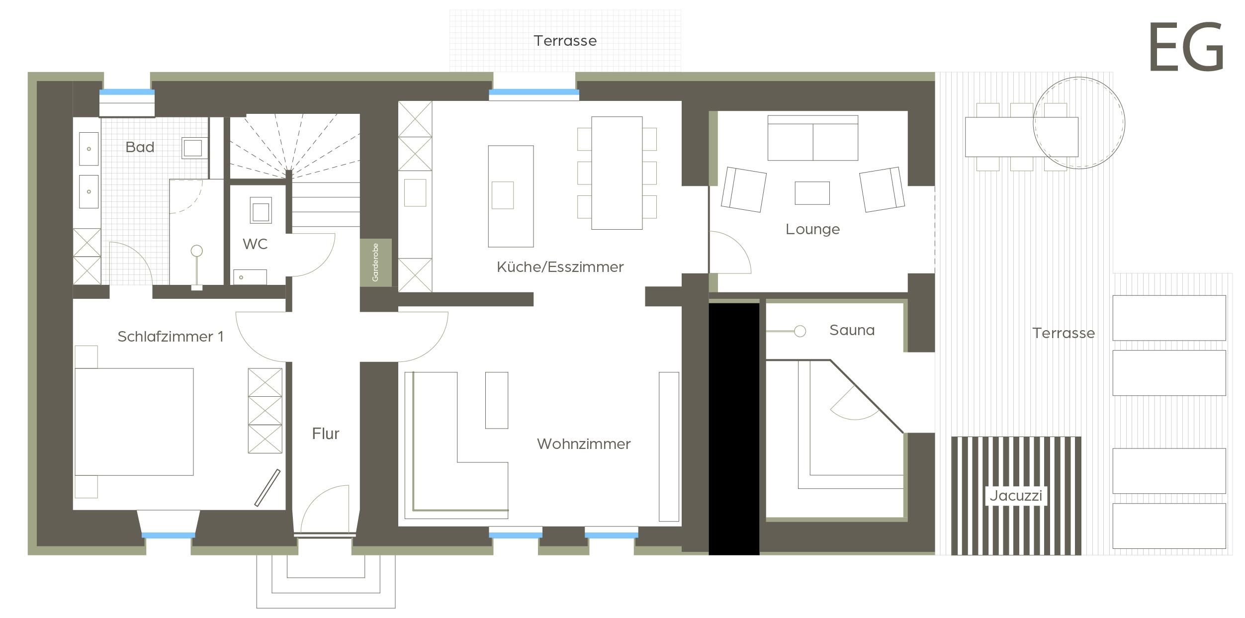 Das Ferienhaus erstreckt sich über zwei Etagen und verfügt über drei großzügige Doppel-Schlafzimmer. Das Hauptschlafzimmer im Erdgeschoss bietet ein eigenes Bad und viel Privatsphäre. Im Obergeschoss befinden sich zwei weitere Zimmer mit begehbaren Kleiderschränken. Eines der Betten bietet zudem einen herrlichen Ausblick auf die grüne Umgebung.