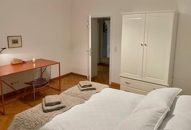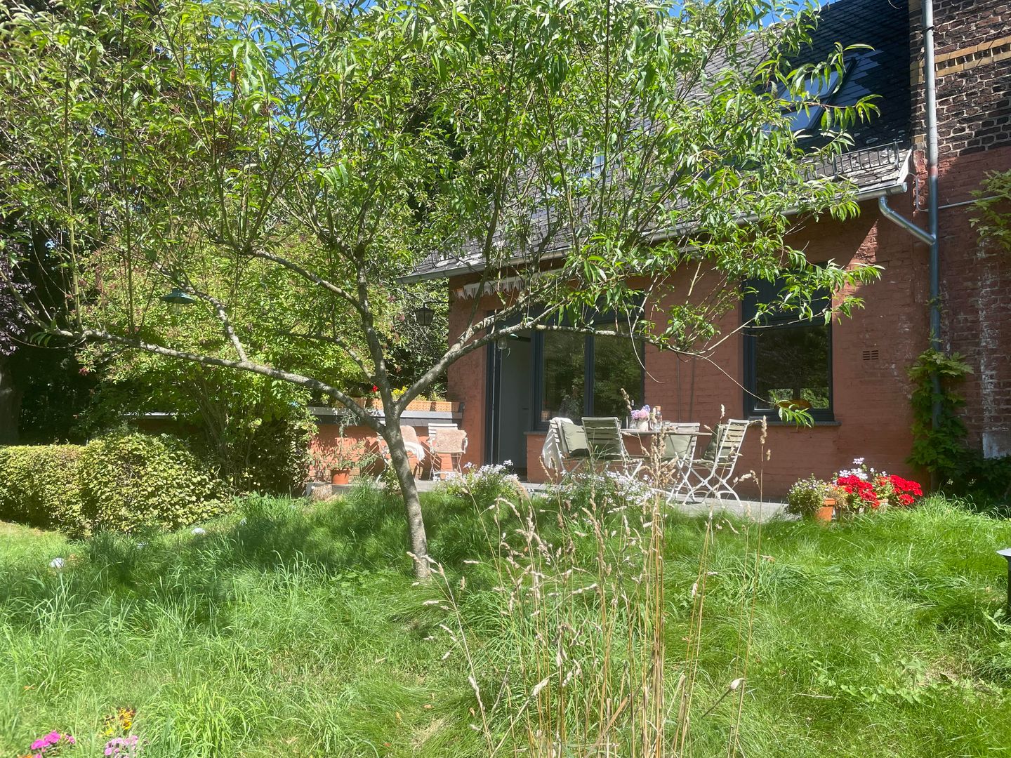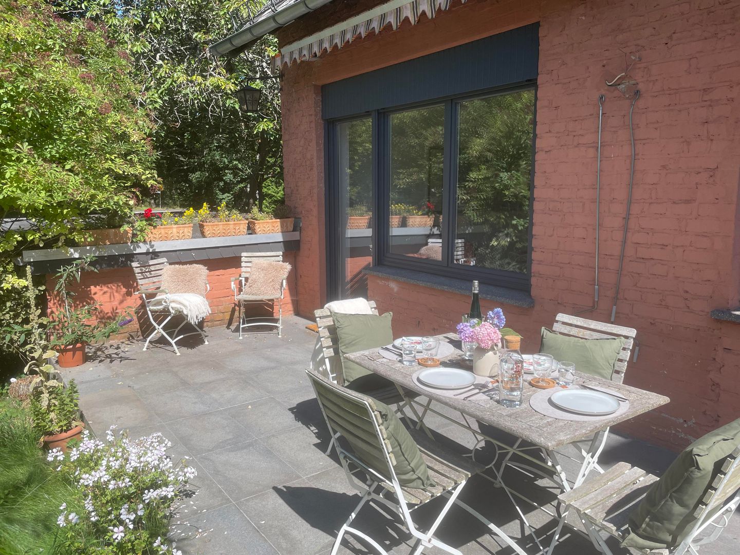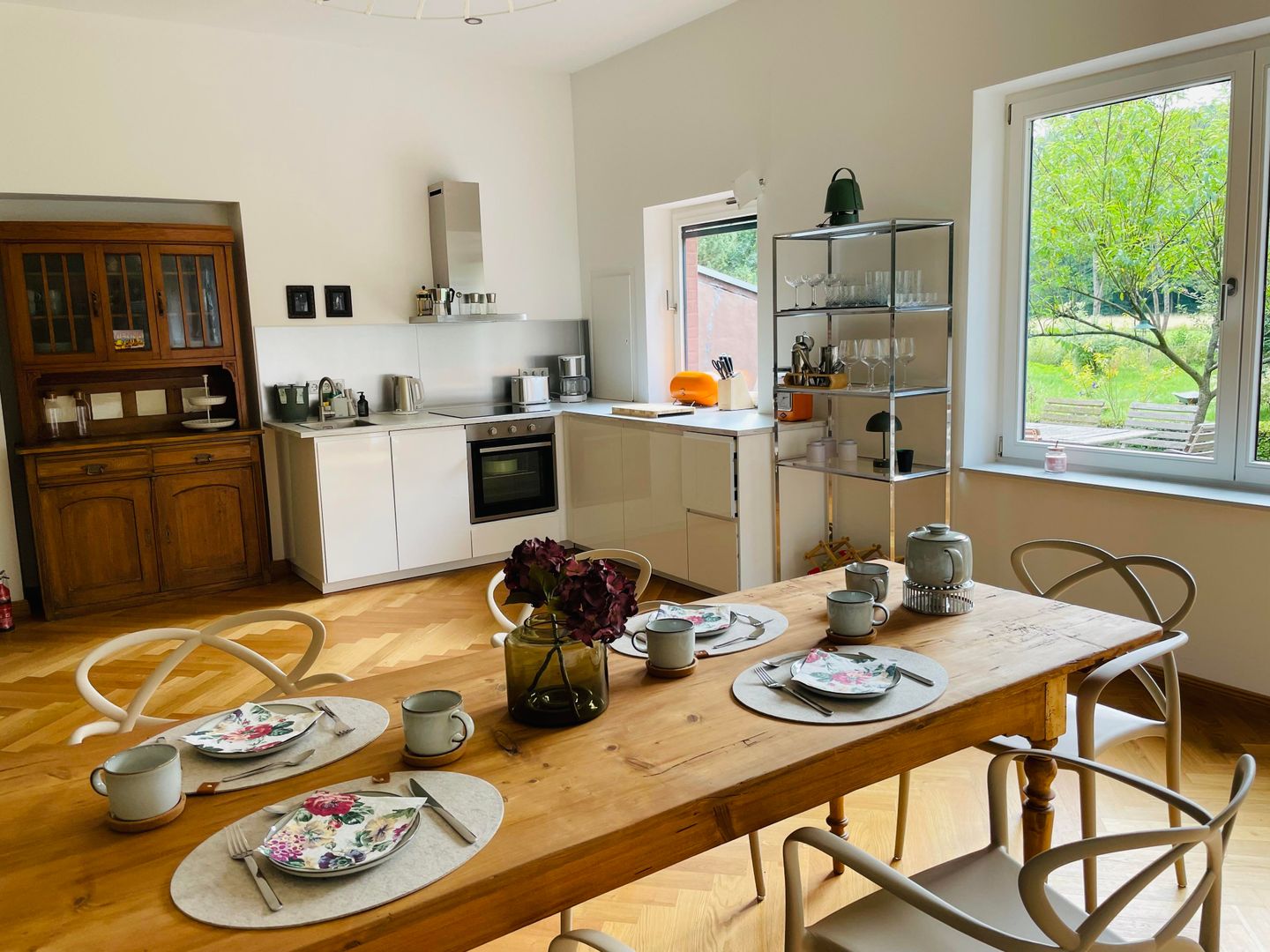 Eingebettet in die historische Atmosphäre des Hauses ist ein modernes Feriendomizil mit hochwertigem Parkettboden, Fußbodenheizung, zwei Schlafzimmern, einem lichtdurchfluteten Wohn- und Esszimmer, sowie zeitgemäßen Sanitäreinrichtungen und einer wunderschönen Terrasse mit Blick in den wilden Garten entstanden.